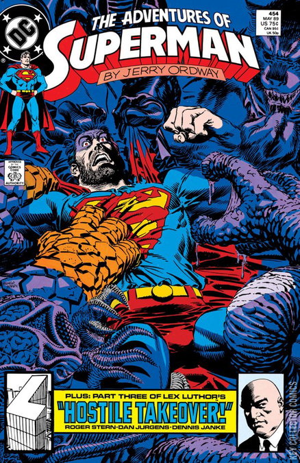 While Superman is held captive aboard an intergalactic slaveship in space, on Earth the cops would like to talk to Clark Kent about the charred body found in his apartment. Written and drawn by Jerry Ordway. Plus, part 4 of Lex Luthor's 4-part "Hostile Takeover" tale, by Roger Stern, Dan Jurgens and Dennis Janke, continued from Superman (1987) #31. Cover by Ordway.