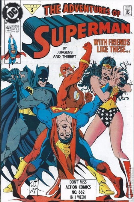 Cover pencils by Dan Jurgens, inks by Art Thibert. Sleaze Factor, script and pencils by Dan Jurgens, inks by Art Thibert; Ugly Mannheim uses Killgrave and Toyman to build Happyland, a park Intergang can use to launder money; Sleez uses the park to kidnap children, which gets Superman's attention. 1991 Triangle #5.