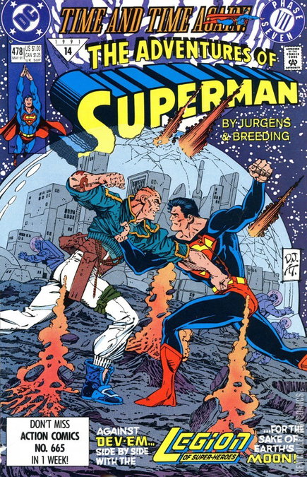 Part 7 of the 7-part 'Time and Time Again' series, continued from Superman (1987) #55. Catapulted to the time of the Legion of Super-Heroes, Superman's found a way back to his present...propelled by the force of Earth's exploding moon. The tale of the exploding moon is continued in Legion of Super Heroes (1989 4th Series) #19. Written and penciled by Dan Jurgens and inked by Brett Breeding. Cover by Jurgens and Art Thibert. Story is continued from SUPERMAN (DC, 1987 series) #55. The Legion era is set in the year 2995. 1991 Triangle #14.