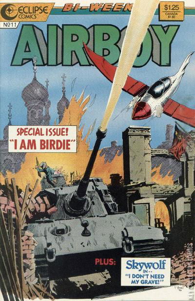 This issue features a different type of Airboy story: the origin of Airboy’s plane told from the viewpoint of the plane. Issue also has a one-page text feature on “The Flying Fool” and Sky Wolf in “I Don’t Need My Grave – Part 1” in which Sky Wolf helps a friend threatened by drug smugglers.
