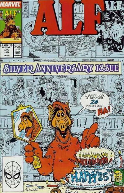 Special 25th anniversary issue in which the coat burglar (from issues #4 and 16) returns and is seeking revenge against ALF. How does the coat burglar get his revenge? He kidnaps ALF and holds him for ransom and the Tanners try to figure out a way to rescue their furry alien friend in "The Silver Annimercenary." Issue also has an ALF 25th Anniversary pinup.