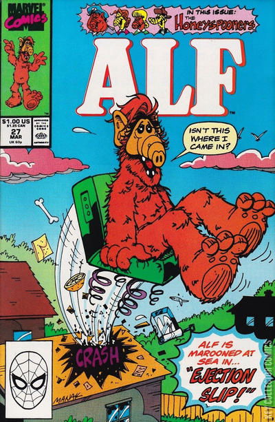 Brian launches the ejection seat from Alf's ship with Alf in it. Alf lands somewhere in the Pacific Ocean. Instead of flares, he finds Plair pens. Alf catches a fish and uses the skeleton as a paddle. He spots a tropical island and heads toward it, only to be caught by a sub that surfaces under him. He clings to the periscope as it reveals that the island is actually a secret base, belonging to the Alien Task Force. He hides in a line of models of supposed aliens, one of which resembles ET. He steals a sup, accidentally torpedoing a ship. The rest give chase, but he dives an loses them. He calls Willie on his ham radio and arranges a meeting at a deserted marina. Alf recounts the tale of the Honeyspooners. Alf helps Brian learn to play the trumpet