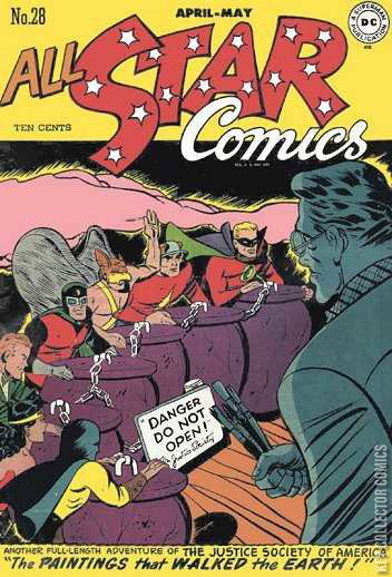 THE PAINTING THAT WALKED THE EARTH! In an unspecified future age, archeologists uncover several sealed jars of paint accompanied by a warning message from the Justice Society of America. The message tells the story of a painter / archeologist who discovered six jars of magical paint from Atlantis. These enchanted paints had the power to make anything illustrated with them come to life when struck by moonlight. The artist used it to create six paintings with the intent of exacting revenge on six college classmates. Soon afterwards, however, the artist was in a disastrous car accident that caused him to have a change of heart. From his deathbed, he contacted the Justice Society and alerted them to the dangers now facing his rivals, hoping they could save them from certain death. One painting depicted a group of gangsters. Hawkman rescued a rival archeologist from these gangsters. The archeologist had just recovered a treasure trove of Atlantean artifacts and was unwilling to flee from the gangsters. But he and Hawkman learned the hard way that the gangsters are indestructible. Knowing the paintings had to be back in the canvas by morning, Hawkman took the canvas and led the mobsters away from their target victim until them. Green Lantern contacted a big game hunter and warned him about the painting of archers. The hunter's rivals overheard Green Lantern's warning and opened the painting. They paid for their devious actions by being shot down by the archers in the painting. The screams gave the hunter time to escape and warn Green Lantern but his power ring was ineffective against them. The Lantern and the hunter fled. As dawn neared, Green Lantern took the canvas away, forcing the archers to chase him. Doctor Mid-Nite warned a mine owner about the dangers of the painting of Medieval knights he received. The owner didn’t believe Mid-Nite's warning until he saw the knights in the painting attacking his miners. Dr. Mid-Nite jumped into the mine to fend off the knights, allowing the miners to escape. He then took off with the canvas on skis to lead the knights away from the mine. Johnny Thunder and the Thunderbolt flew to an ocean liner to rescue a ship's captain. Unfortunately, the Captain had several paintings in his possession and Johnny couldn’t tell which painting was the problem, so he attacked one at random. Thinking he was crazy, the captain threw him in the brig. Later, a painting of seahorse cowboys came to life. The Thunderbolt broke Johnny out, but neither was able to stop them. Johnny grabbed the canvas and the Thunderbolt flew them away from the ship. The Atom journeyed to the estate of an oil baron just in time to fight off the moors from his painting. He was eventually overwhelmed. After they’d defeated him, they began rampaging out in the oil field. Unable to find a way to stop them, the Atom flees with the canvas. The Flash set out to save a circus owner from a painting of cavemen and prehistoric beasts. But the circus owner, determined to entice Flash into joining his circus, talked so much that the cavemen came to life before he was finished. The Flash dealt with them easily but simply they kept coming. Eventually, he was able to trap them using super speed, then took the canvas and ran away with it. All the members converged at Justice Society headquarters with the blank canvases in their possession and painted figures in pursuit. After hanging up their canvases, the beings return to their paintings. Flash decided that the best plan was to scrape the paint back into the original jars. Hawkman welded the jars back together, Green Lantern sealed the jars with his ring, and Wonder Woman wrote the warning to all future people to not open the jars.