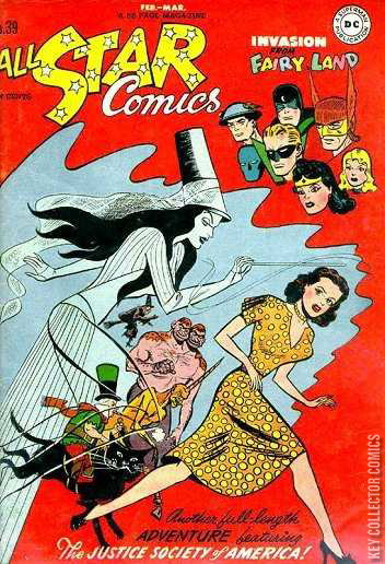 THE INVASION FROM FAIRYLAND Sally Barnes, a young stenographer, was given the 'Voice of the Lorelei', a magical power that makes her voiced wishes come true. With the power, she accidentally kills her boss, and is tried for murder and witchcraft. She is found guilty and sentenced to death. Her counsel, convinced of her innocence, writes a letter to the Justice Society of America asking for help. The members, who don't believe in witchcraft, meet with Sally in jail to hear her side of the story. She tells the members of her dream, where Rumplestiltskin gave her the Voice of the Lorelei and vanished into a hillside. A notorious hoodlum, the the Slicer, eavesdrops on their conversation. After the JSA leaves, the Slicer breaks out of jail and follows the Justice Society, hoping to obtain the 'Voice of the Lorelei' for himself. However, Black Canary, happens to be nearby, and trails the Slicer. Going to the sight of Sally's dream, Green Lantern uses his ring to reveal a secret entrance to Fairyland. Using the combined powers of the Justice Society, they able to force open the door. The JSA enter Fairyland and immediately are attacked by, and defeat a two-headed ogre. After the battle Rapunzel tells them to flee, since The Loreli, the tyrannical ruler of Fairyland, is approaching. Unafraid, the JSA confront her, but the Loreli turns them into stone with her magic mirror. During the confrontation, Rapunzel fled to visit the Old Wise Woman, who is able to cast a spell to restore the JSA. Once restored, the JSA split up. Atom and Flash try to rescue Rapunzel. Pursing Rapunzel, Flash finds that his speed is gone. The Wise Woman tells Flash that since his speed is scientific, it does not work in Fairyland, but she tells him where to find magical shoes to restore his speed. The Atom fights off the guardians, and Flash gets the shoes. Flash catches up to Rapunzel, but Rumplestiltskin has already captured her, and he charms Flash and Atom, then escapes. Wonder Woman and Doctor Mid-Nite follow the ogre. They find Hansel and Gretel, who lead them find the ogre. After defeating him again, Hansel tells Wonder Woman that the only way to catch the Lorelei is by wearing the 'Cap of Knowledge' hidden in the city of witches, so the pair set off to find the cap. After fighting off some large dogs, they find Black Canary, who tells them that the Slicer is looking for the Lorelei. They enter the city of witches, where Dr. Mid-Nite finds a spell book and casts a spell of darkness to give them the upper hand. Wonder Woman puts on the Cap of Knowledge, and learns that the Slicer and the Lorelei have teamed up to trap and kill the Justice Society. Green Lantern, Hawkman, and Johnny Thunder set off to find the Lorelei. They discover an invisible fairy, who was cursed by the Lorelei. She tells them about a magic wishing ring guarded by a dragon. Hawkman and Green Lantern fight the dragon using their powers, which still work, since they are based on magic, while Johnny goes after the ring. Johnny gets the wishing ring, and makes himself enormous, and kicks the stuffing out the dragon. The three of them reach the dark castle, rescue the prisoners from the dungeon, and capture Rumplestiltskin. However, the Slicer gets the drop on the Green Lantern, and the Lorelei captures them, and scrambles their heads and bodies, so that they can't use their powers. Following the Slicer's advice, the Lorelei begins to plan her invasion of the earth, but the rest of the Justice Society breaks into her castle. Using magic to disguise herself, the Lorelei captures them by dropping the drawbridge on top of them, and turns them into animals. To save themselves, Green Lantern hypnotizes Johnny to give him enough will-power to operate the Green Lantern Ring. Johnny frees them with the ring, then restores their bodies. In their escape, they come across the rest of the JSA, whom Green Lantern restores with his ring. Wonder Woman dons the Cap of Knowledge again and learns that every thousand years Fairyland and earth coincide, allowing passage for 24 hours. She also learns that Sally Barnes was given the Voice of the Lorelei as a ruse by the Wise Woman, masquerading as the Lorelei, so that the Justice Society would be forced to come to Fairyland to rescue them from the Lorelei's rule. The JSA follows the Lorelei back to earth, where the Lorelei's army is destroying Gotham City. Meanwhile, the Slicer and the Lorelei are robbing a museum where the Lorelei knows the Philosopher's Stone is being displayed. Once the Lorelei steals the stone, she feels that the Slicer has outlived his usefulness, she magically transforms him into a dog. The Justice Society captures all of the Lorelei and her army, but at that moment, Earth and Fairyland separate, causing all of the creatures from Fairyland to age 1000 years, and they turn into dust. Wonder Woman uses the Lorelei's magic wand to undo all of the damage to the city, and Hawkman drops all of the magic relics into the ocean to keep them from being used by criminals.