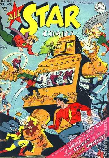 THE SECRET OF THE GOLDEN UNIVERSE! The Justice Society of America responds to a newspaper appeal for help from Raymond, an escape artist, who is in fear for his life. When they arrive, Raymond tells them his fantastic story. Recently, Raymond attended a show featuring Aurikon and his gold men. Raymond intended to prove that the act was a fraud, but instead, Raymond proved that the men were truly made of gold, by covertly taking of sample of Aurikon's hair and performing chemical analysis. Before he could alert anyone, the gold men broke into his apartment, knocked him out, and threw him into a river chained inside a box. Naturally, being an escape artist, he escaped, and set out to contact the Justice Society. After listening to the story, the Justice Society agree to help, and with Raymond, they go to interrogate the gold men. Instead of finding them, they find hundreds of bars of steel, which they connect with a series of strange robberies. The gold men arrive, and get the better of the Justice Society in combat, due to their hard metal bodies. The gold men then disappear by riding on a carnival ride at the speed of light. The Justice Society give chase by having Green Lantern use his power ring to duplicate their ride. The Justice Society find themselves in the Golden Dimension, where life is based on gold, rather than carbon. They meet Myrla, chief scientist, and ruler of the golden people. When Flash tells Myrla that gold men have been stealing iron from the Carbon Dimension, she tells them that her half-brother Aurikon must be stealing the iron to power three giant robots in order to take over as ruler. Splitting up, Hawkman, Doctor Mid-Nite, and Atom go after the first robot. The robot grabs Hawkman and Atom, so Dr. Mid-Nite enters the robot, defeats the pilots, and takes over the controls to stop Hawkman and Atom from being crushed. However, Aurikon rigged the controls with a high voltage current, knocking out Dr. Mid-Nite. Wonder Woman and Black Canary I get to their robot before Aurikon's men, and power it up to scare them off. Aurikon returns with a larger group, but Wonder Woman and Black Canary knock them out. Thinking they've defeated them, they let their guard down, and are knocked out by Aurikon's surprise attack. Flash and Green Lantern corner the last robot in a cave and defeat it. However, the heat from a pool of molten gold in the cave overwhelms them, allowing Aurikon to easily defeat them. With the Justice Society out the way, Aurikon takes over, and confronts Myrla. Myrla is defiant, convinced that the Justice Society will stop him. Gloating, Aurikon shows Myrla that he has imprisoned them in a glass case in a state of suspended animation. To stay in power, however, Aurikon requires a constant supply of iron, so he offers Raymond a deal: for every pound of iron Raymond steals from earth, Aurikon will give him a pound of gold. Raymond refuses, then escapes his bonds. Sensing his only chance is to free the Justice Society, he breaks through their case, awakening them. Freed, Wonder Woman, Atom, and Green Lantern destroy the three giant robots and capture Aurikon. Finally, they return home using Flash's speed to pull them and Green Lantern's ring to push them to the speed of light. BLUE BOXER CRIMES