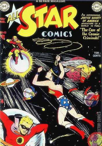 THE CASE OF THE COSMIC CRIMINALS! While investigating the mysterious disappearance of the Rocky Castle gang, the Justice Society of America discovers Professor Egri, tied up in his private laboratory by Rocky's gang. The professor tells his story and starts by explaining that he has been studying cosmic radiation. By using his specially designed a cosmic filter, he was able to charge six ordinary objects with cosmic power, but only when a specific nova was visible in the sky. While testing the objects, the Rocky Castle gang appeared at his house, looking for a hideout. They stole all of his cosmic-powered objects and tied up the professor. Black Canary stays behind with Egri, while the rest of the JSA set out to find Rocky's gang. Checking in with a professor at the science foundation they find four locations with unusual increases in cosmic radiation, forcing them to split up to track down the gang. Wonder Woman and Hawkman discover Ox and Gun-Shy attempting to escape the police after a botched theater robbery. Catching their quarry is made more difficult when the gang's cosmic powered objects give them similar powers: Ox's stick pin allows him to fly and Gun-Shy's watch allows him stop bullets. The gang tries to ambush them, but Wonder Woman and Hawkman easily outwit them, and take back the cosmic objects. However, touching the cosmic objects causes the heroes to disappear. Doctor Mid-Nite and Atom find Peewee and Specs escaping after a carnival robbery, aided by their cosmic objects: Spec's flashlight allows him to black out the light and Peewee's gloves give him super strength. With Doctor Mid-Nite's ability to see in the dark, and Atom's super-strength, they knock out the crooks, but when they retrieve the cosmic objects, they suffer the same fate as Wonder Woman and Hawkman. Flash arrives at a millionaire's mansion to find that he is giving away his money to his friends for his 70th birthday. Slowpoke, posing as a waiter, knocks the millionaire out and takes the money, but he is quickly discovered. He makes his getaway when his cosmic powered jacket activates and gives him super speed. Flash gives chase, catches him, and knocks him out, only to disappear when he picks up the jacket. Rocky Castle, the leader of the gang, steals a valuable ivory necklace. He escapes with the help of his cosmic powered ring, which, like the the Green Lantern's ring, works by will power. Green Lantern arrives, and the two battle to a stalemate with their rings, forcing Green Lantern to knock out Rocky with his bare fist. As he picks up the ring, the same thing happens to Green Lantern. The crooks, having seen their JSA foes fade away after picking up the cosmic powered objects, return to Dr. Egri's for an explanation. Dr. Egri shows them that he used the objects to capture the Justice Society, whom are now on display in his laboratory. Donning all six objects, he explains to the gang that they were only pawns in his plan to capture the JSA, and instructs Black Canary to execute them. Black Canary, who was pretending to be brain-washed by Egri, pistol whips Egri instead, then rescues the JSA, who easily handle the gang. Dr. Egri, having recovered, starts to use all six objects, only to be disintegrated by the incredible force of all the objects.