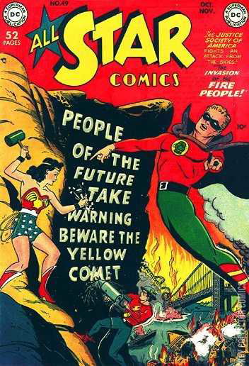 THE INVASION OF THE FIRE PEOPLE A comet passes by and strange meteors land across the country, and lick clockwork, fires erupt nearby. The Justice Society decides to look into this, only for one of the meteors to land right outside their headquarters. They seek the input of a Dr. Conrad, who reveals a bizarre film recording he found through uranium emissions: a million years ago Earth was home to a super-advanced society, and the man who made the recording on the uranium warns the world of the future of how they were wiped out by flame-men who came from meteors dropped by a comet. Noticing the pattern is identical to the one facing the world now, the Justice Society splits up to investigate all the meteor landings. The Atom and Black Canary visit Palomina Unversity which is one of the country's biggest stockpiles of Radium, which the flame people stole before. Sure enough the flame people arrive to plunder it, and the terrible heat they give off forces the heroes to retreat in defeat. The Flash and Dr. Mid-Nite track down another group of flame people to another radium stockpile, and have better luck by thinking to use asbestos suits. However they are also defeated when flame people pull off their hoods from behind while another melts open a jar of ether and the fumes knock them out. Hawkman and Wonder Woman stake out one of the biggest uranium-refining plants in the country and run into a group of flame men, who use their heat to evaporate a pool of water and create a blanket of steam to cover their escape. Green Lantern finds where the flame people are building their escape craft, and is attacked by a group of them. His ring protects him from their heat, but the heat they give off also acts as a buffer keeping his beam from overcoming them. They unleash a powerful radium gun, starting to work through even his protective powers, forcing the emerald crusader to retreat. The army soon arrives in response to Green Lantern's warning, but are unable to defeat the flame men either. Dr. Conrad is convinced that the human race is about to die from the radioactive exhaust left by the flame people's escape craft, just as it did a million years before. He's carving a warning into a rock face so that future generations may know of the danger of the flame men, but the Justice Society interrupt him and ask for a certain scientific apparatus to carry out one last-ditch plan. The JSA attack the flame people with carbon arc projectors, which give off even greater heat than the flame people themselves. They came up with the idea when they remembered the old saying "fight fire with fire". Beaten by their own main attack, the flame people turn one of their radium guns on themselves and commit suicide rather than be captured. The comet will return in another million years, but now Conrad's message tells humanity how to defeat the flame people instead of to await their doom. LARRY MINTER WAS INNOCENT
