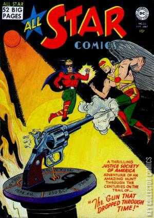 THE GUN THAT DROPPED THROUGH TIME! The Justice Society are attending a convention for inventors when a Dr. Swanley buddy of theirs is killed. Suspicion falls on Ted Weldon, the fiance of Dr. Swanley's ward, but he reports seeing a man toying with a gun inside Dr. Swanley's booth just before the murder. Green Lantern uses his ring to search the building and ever attendee, but nobody has a gun like Weldon described, and he's accused of the murder. He's quickly declared guilty and sentenced to execution, and the Justice Society race to find some way to exonerate Weldon, and with no other leads try to determine the purpose of Dr. Swanley's bizarre invention, which no-one else knew. After finding some old notes of his they divine that the machine is a "time chute", and that the gun used to kill Dr. Swanley was thrown into it after he was killed. The JSA dive into the machine to find it and exonerate Ted Weldon. Black Canary and Flash find themselves in the palace of Timur in ancient Asia. He does indeed have the gun they're looking for, but realizing it must be valuable for these powerful people to want it, he sends his guards after them. The heroes easily defeat their attackers, but the gun suddenly disappears out of Flash's hand. Wonder Woman and Dr. Mid-Nite find the gun in the possession of Attila the Hun. The ancient conqueror is no match for Wonder Woman's Amazon might and they get the gun, but it disappears again. Hawkman and Atom are in ancient Rome, and when they see an ad for Spartacus fighting in the arena with a new weapon, they figure it might be the gun they're looking for. The heroes are right, and with their modern fighting skills easily overcome him and get the gun. When they refuse to slay their downed opponent the entire arena gangs up on the JSA members and soon even the mighty heroes are overwhelmed, but their heroic example inspires Spartacus to call out to his fellow gladiators to be slaves no longer. Once again the gun disappears out of the heroes' hands. Flying solo as usual, Green Lantern finds himself in a high-tech city but can't understand how this civilization is unknown in his own time. He's accosted by a guard, who pulls the gun the JSA's looking for on the hero. Green Lantern easily fends off his attack and seizes the gun, and is confronted by the city's queen, who's planning to launch her air force to conquer the rest of the world. Before the conquest can begin and Green Lantern's forced by superior numbers to join in, an earthquake suddenly strikes and sinks the city. Green Lantern realizes he was in Atlantis all along. Like with the others the gun starts disappearing but Green Lantern conjures up a giant magnet with his ring and pulls it back to his grasp. Back in their own time, the Flash takes the gun and runs at high speed to present the murder weapon and get a stay of execution for Ted Weldon. The JSA are then called to meet Eric Pomar, the murdered scientist's best friend. He actually murdered Swanley to steal the scientist's great inventions and use them to gain great power. Pomar shoots the JSA with a "self destruction beam" that makes them want to commit suicide but Dr. Mid-Nite tricks Pomar into shooting it at a mirror and hitting himself. Before any of the heroes stop him Pomar jumps out a window. THE RACE OF WHEEL AND KEEL