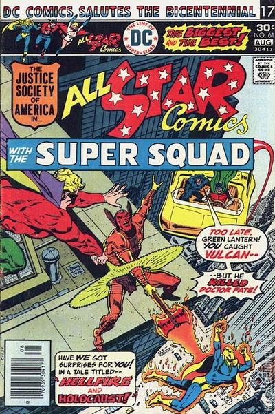 HELLFIRE AND HOLOCAUST Vulcan battles against the Golden Age Green Lantern and Doctor Fate. Though his fiery volley is blocked by the Golden Age Green Lantern, a portion of the energy reflects off the ring construct. The excess energy impacts with several surrounding buildings, raining masonry down on the citizens below. The Golden Age Green Lantern is forced to break off his attack to save the innocent bystanders. Vulcan vents molten magma into the sky, which showers down on the streets in a white hot rain. This, too, is blocked by the Golden Age Green Lantern. Doctor Fate attacks Vulcan, drawing his attention away from the civilians. It's all Doctor Fate can do to stalemate Vulcan's attack, long enough for the Golden Age Green Lantern to ferry the civilians to safety. With one last push, Vulcan's power literally explodes out of him, demolishing the building he and Doctor Fate were fighting upon.As Vulcan flies away, the Golden Age Green Lantern desperately searches the rubble for some sign of Doctor Fate. Vulcan, however, doesn't get far, as an errant shaft of sunlight sends him crashing to the ground. In Gateway City, archaeologist Carter Hall dismisses the concerns of his colleague, regarding the discovery of the ancient Lemurian, Zanadu. His body preserved in a block of amber, which, unbeknownst to both men, seems to be dissolving. Vulcan comes down hard in the Penn Central Freight Yards. His momentary weakness, though, is fast fading. The Golden Age Flash, Power Girl, Wildcat, and the Star-Spangled Kid, stand outside the Justice Society of America's headquarters, as it burns to the ground, the aftermath of their earlier battle with Vulcan. The Golden Age Flash's wife, Joan Garrick, breaks through the police barricades, to embrace her husband. Garrick pleads with him to retire. Reluctantly, the Golden Age Flash acquiesces to her wishes.To bolster their manpower, Power Girl summons the Golden Age Hawkman and Doctor Mid-NIte. No sooner do they arrive on the scene then the team receives...
