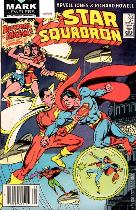 The All Star Squadron have there first encounter with Captain Marvel. They believe him to be a super powered Axis agent. It isn't until they battle that they realize he is under the sway of the Spear of destiny (held by Adolf Hitler). They then learn that he is from a parallel Earth (S).