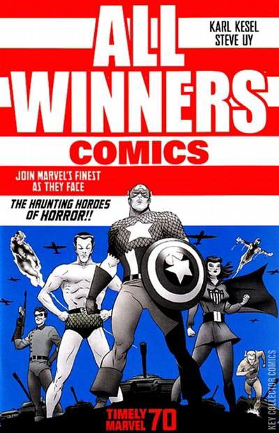 Captain America and Bucky…the Human Torch and Toro…the Sub-Mariner…Miss America…the Whizzer…THE ALL-WINNERS SQUAD! It's 1946 and World War 2 is over, but the memory of those lost in the War haunts everyone— especially when Times Square is overrun by undead soldiers wanting their lives back! And leading this tattered battalion are the two casualties the All-Winners Squad can't fight— the original Captain America and Bucky! Plus: a surprise romance that has all the tabloids a-twitter! "Old Soldiers Never Die…" by Karl Kesel (MARVEL APES) and Steve Uy (AVENGERS: THE INITIATIVE) Buy Bonds! And this comic!