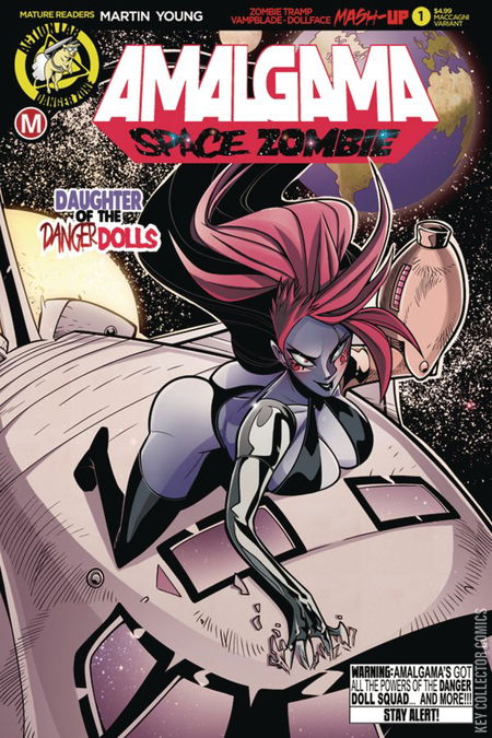 Now in her own series, the fan favorite Zombie Tramp/Vampblade/DollFace mash-up (with the powers of all three iconic characters) returns! Rocketed into space by the Danger Doll Squad, Amalgama: Space Zombie plots a course for explosive sci-fi grindhouse action! Features 4 regular and risqué variants, including cover 1 of 3 from the Elias Chatzoudis Amalgama variant set!