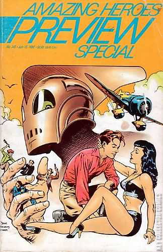 Amazing Heroes Preview Special - Summer 1988. Twenty-Two Comic Books Alan Moore is Looking Forward to This Year. Plus: Comments from Mark Verheiden (Aliens, The American), Jim Starlin (Batman: The Cult, New Gods), Howard Chaykin (Black Kiss), Mindy Newell (Catwoman), Dave Sim (Cerebus the Aardvark), Paul Chadwick (Concrete), J.M. DeMatteis (Doctor Fate, Mr. Miracle), Peter David (Dreadstar), Chris Claremont (Excalibur, Wolverine, X-Men), John Ostrander (Firestorm, Manhunter), Kim Yale (Manhunter), Bob Burden (Flaming Carrot Comics & Stories), Mike Grell (Green Arrow), Matt Wagner (Grendel), Mark Evanier (Groo), Jamie Delano (Hellblazer), Chuck Austen (Hero Sandwich), John Moore (American Flagg!), Keith Giffen (Invasion!, Justice League International), Paul Levitz (Legion of Super-Heroes), Pat Mills (Marshal Law), Michael T. Gilbert (Mr. Monster), Arn Saba (Neil the Horse), George Perez (New Titans, Wonder Woman), Carl Potts (Punisher War Journal), Dave Stevens (The Rocketeer Adventure Magazine), Marv Wolfman (Sable), Trina Robbins (Strip AIDS USA), Scott McCloud (Zot!), Stan Sakai (Usagi Yojimbo), Bill Sienkiewicz (Stray Toasters), Alan Moore (The Mandelbrot Set) and more. Rocketeer cover by Dave Stevens.
