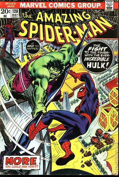 THE FIGHT AND THE FURY! Spider-Man's fight with the Hulk has taken them under water when the Hulk accidentally compromises the integrity of a dam. However, their fight is soon interrupted when General Ross arrives with the military, and their fire power forces both combatants to part. Secretly hitching a ride back to Montreal, Spider-Man changes back into Peter Parker. When calls to check in on Gwen, she tells Peter to come back to the States as quickly as possible because Harry has had a relapse from his previous drug overdose. Peter tells her that he has to finish business in Canada but he will be back as soon as possible. When Peter finds that he's being trailed by someone, he changes into Spider-Man and confronts them. The man explains that he was hired by Dr. Octopus to seek out Mr. Rimbaud (the man Peter had come to see in Canada), prompting Peter to go and see the man as quickly as possible. Rushing to the site of the '67 Expo where Rimbaud was discussing some business to put a new building Peter, Rimbaud, and his secretary are attacked by the Hulk. Peter changes into Spider-Man and battles the Hulk until the military scares him off again. Changing back to Peter Parker, Peter is met by Rimbaud who has important information to tell him when he's suddenly shot by a mysterious shooter and dies. With no leads to follow, Peter can do nothing but return home.