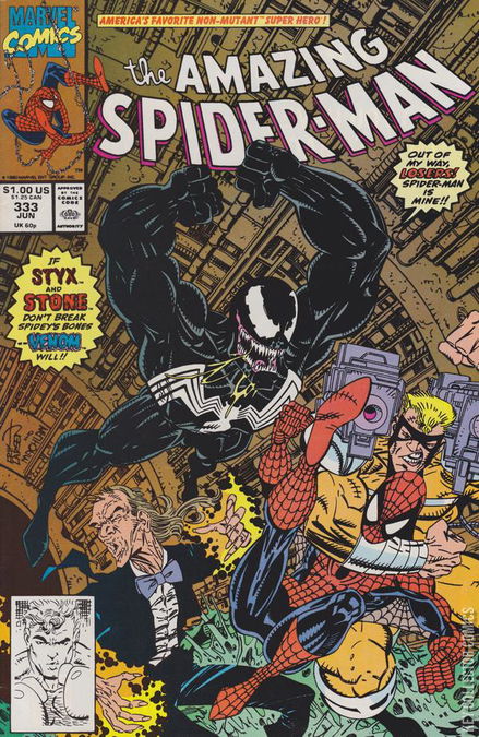 STALKING FEAT! At his Aunt May's home, Peter Parker wonders where Venom might be, unaware that the homicidal maniac is lurking just outside the window. Peter feels ineffectual because his spider-sense cannot pick up Venom thanks to the alien symbiote he wears. That's when Aunt May enters the room with some hot coco, after noting that Nathan Lubinsky has nodded off again. She asks Peter where his wife Mary Jane is, and Peter tells her that she had other plans so he decided to come over and visit his aunt. When Aunt May realizes that she forgot the marshmallows she goes back into the kitchen. While she is gone, Venom manages to sneak up behind Peter. Venom hands a map to the bomb shelter where he has holed up and asks Peter to meet him there within 24 hours, or else. Furious, Peter tells Brock that he is sick of Venom threatening his Aunt May. This wounds Venom, as he considers Peter's aunt an innocent and promises to never harm her, offering to shake on it. Realizing that Eddie Brock has a sick sense of honor, Peter shakes on it. Having heard talking in the other room, Aunt May asks Peter who he is talking to. Parker tells her that it is an employee of the gas company. To sell this ruse, Venom changes his costume into that of a blue-collar worker and walks out just as Aunt May is entering the room. When Peter returns home, he suggests that he and Mary Jane take off for a vacation in Aruba. However, Mary Jane can't take time off from "Secret Hospital" and that they can't afford a trip. When Peter points out that they can still get her money back in the lawsuit against Jonathan Caesar, Mary Jane explains that she already signed a no contest agreement.[Continuity 4] Peter asks why she did that, confident they could have one the trial. However, Mary Jane couldn't bear to be in court where Caesar will leer at her for hours. Understanding his wife's position, Peter tells her that he understands and will get a refund for the plane ticket, even though his plans to get his wife away from Venom have just been quashed. While at Bedford towers, Jonathan Caesar demands that Styx and Stone destroy Spider-Man. Stone explains how when they went to Central Park to battle the wall-crawler, they found Venom on the scene fighting the hero. Figuring that Venom could lead them to Spider-Man, the pair followed after him, but lost him in a maze of abandoned subway tunnels. When Styx uses his powers to feed off a plant, Stone sends him to wait outside. Caesar asks what caused Styx to become a life-force stealing vampire. Stone explains that his partner was a homeless man suffering from cancer that was enlisted to test new experimental cancer treatments. Stone conducted his own independent studies, using Styx as his test subject. His treatment cured Styx, but made him a living cancer in the process. Meanwhile, Peter Parker decides to pay a visit to Flash Thompson where he holds boxing classes for children to get some advice. He worries that Felicia Hardy might be there, but to his relief she is not. After ending his session, Peter asks Flash about his volunteer work with underprivileged children. Thompson explains that he wanted to be a role model to these kids, since his own youth was devoid of such people. The exception was the fact that Flash idolized Spider-Man, and he has been using the wall-crawler as an example to guide him to always do the right thing. This reinvigorates Peter, and he thanks Flash for the advice. That evening, Styx and Stone are staking out the sewer pipe that Venom escaped into earlier that day. As their luck would have it, they witness Spider-Man enter the pipe in order to make his rendezvous with Venom. Eventually, Spider-Man finds the abandoned bomb shelter that Venom has set up operations in. Venom is waiting for him, and reiterates his hatred for Spider-Man. However, this bit of exposition was merely to distract Spider-Man while the symbiote tried to attack him from underneath. Leaping to safety, Spider-Man webs up some of the weights laying around and tries to throw them at Venom, but misses. When Venom lunges to attack, Spider-Man's spider-sense warns him that something is behind him and he ducks. This causes Venom to be struck by a chain fired out of the Stone's shoulder cannon. Although Venom breaks free, Stone hits him with a sonic blast that weakens the symbiote. While Brock is incapacitated, Spider-Man tries to get away, but Styx and Stone impede his progress. Venom eventually recovers and launches an attack on Stone, while Spider-Man avoids Styx's deadly touch. Venom shrugs off all of the different attacks that Stone launches on him, getting close enough for the maniac to crush his shoulder cannons. Stone calls Styx for help and his partner dutifully leaves his fight with Spider-Man to help. Styx touches Venom's body, causing extreme pain to the symbiote. Not wanting anyone to die, Spider-Man leaps in and knocks out Stone. When he turns to Styx he finds the deadly killer in a state of pure ecstasy. Surprisingly, Eddie Brock survived, but apparently his symbiote did not fare so well. When the authorities arrive to take the villains away, Spider-Man can't help but feel sorry for the alien symbiote for its sacrifice so Eddie could live. Still, he feels relieved that the menace of Venom appears to be finally over.