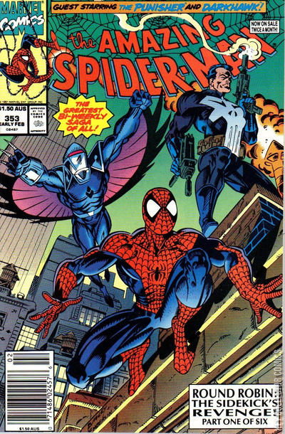 ROUND ROBIN: THE SIDEKICK'S REVENGE! PART 1- WHEN MIDNIGHT STRIKES! In a secret underground bunker, members of the Secret Empire observe their latest recruit, the cyborg known as Midnight, as he fends off a number of armed martial artists. Satisfied with the demonstration Number Seven orders Midnight to stand down. Midnight is also satisfied with his new cybernetic body. Removing his mask, he identifies himself as Jeff Wilde. Number Seven reminds Wilde that he will only be known as Midnight from now on. Seven finds it interested to see that Wilde is complying without their use of a pain-inducing implant, especially since Number Seven was the one responsible for almost killing Jeff Wilde and rebuilding him as a cyborg. He is pleased that he managed to convince Midnight that the Secret Empire has kept up with the times so that it would be considered a viable threat much like its terrorist counterparts in Hydra and Advanced Idea Mechanics. He created Midnight in response to the growing number of superheroes that have appeared on the scene, and particularly since the Empire's last operation was foiled by Moon Knight, the Punisher and Spider-Man. With everything in order, the Secret Empire inform Midnight that his first mission is to break Elliot Franklin, a criminal physicist out of prison in Queens. Meanwhile, in Queens, Peter Parker and his wife Mary Jane have come to visit Peter's Aunt May. In the middle of their visit, Aunt May realizes that she is missing her television show and, much to everyone's surprise, it is a wrestling match that May is watching. Peter decides to take this opportunity to walk through the old neighborhood and leaves Mary Jane to keep May company. Once out of the house, Peter quickly changes into Spider-Man and goes swinging through the neighborhood. He soon comes upon the place where he and Darkhawk had recently battled Hobgoblin. The wall-crawler can't help but think that the novice hero is the same age, if not younger than he was when first became Spider-Man. Recalling how confused Darkhawk seemed, Spider-Man still wonders what was bothering the hero. At that moment at a nearby police station, Chris Powell has come to empty out his father's desk. He thinks about how a few weeks ago he followed his father to a nearby amusement park and witnessed him taking money from Philippe Bazin, a notorious mobster. Unsure if his father was taking a payoff or something, he did discover a mysterious crystal. Upon touching it, Chris Powell became Darkhawk for the first time. There he is greeted by Officer Jimmy Zafar, who tells Chris that the department hasn't had a chance to go through his father's desk for clues to explain his recent disappearance. Chris finds that he doesn't want to talk about the elephant in the room, the possibility that his father was a dirty cop. So when he sees some officers in tactical gear, he asks what it is all about. Officer Zafar explains that they are preparing to transfer Elliot Franklin to the Vault. Suddenly, Midnight comes crashing through the wall and begins fighting his way through the police officers. Witnessing officers getting killed by the cyborg, Chris finds a secluded spot to change into Darkhawk. Meanwhile, Elliot Franklin sits in his cell thinking about how easy it could be to break out of his cell if he still had his powers. Soon, Midnight breaks him out of his cell and tries to escape, only to be ambushed by Darkhawk. Watching this scene unfold are operatives of the Secret Empire are told to stand back and see how Midnight operates against Darkhawk. As Midnight battles the novice hero, Darkhawk is forced on the defensive. At that moment in the Bronx, the Punisher is demanding answers of a drug dealer regarding the Secret Empire's connection to the local influx of drugs. The dealer tries to play dumb, but the Punisher recognizes the Secret Empire insignia ring he is wearing. After roughing him up a bit, the dealer caves and tells him about the Empire's plans to break Elliot Franklin out of jail to exploit his weapons expertise. Thanking the thug for the information, the Punisher decides to spare him to use for more information later. However, the drug dealer tries to shoot the Punisher from behind. Anticipating this, the vigilante manages to quickly turn around and shoot the dealer dead. Back in Queens, the battle between Midnight and Darkhawk rages on. Hearing the commotion, Spider-Man arrives on the scene. After he sets up his camera, he decides to swing down and lend Darkhawk a hand. At that moment, the Secret Empire operatives determine that Midnight is faltering and fly in to assist. Spider-Man leaps in as well. The battle takes a turn when innocent bystanders are threatened by an out of control Secret Empire flying platform. Ultimately, Spider-Man and Darkhawk take control of the situation and eventually pin Midnight to the wall. When Spider-Man pulls off Midnight's mask he is shocked by the mostly cybernetic fact that looks back at him. When Midnight refers to himself by name, Spider-Man remembers him as Moon Knights sidekick who was seemingly killed during their last clash with the Secret Empire. Wilde explains that he survived, and while Moon Knight left him for dead, Jeff was taken in by the Secret Empire and rebuilt him as a cyborg. When this starts reminding Darkhawk of his father, it weakens his concentration, forcing him to drop his forcefield. Before Spider-Man can get him to refocus his attention, he is struck from behind by Elliot Franklin. This allows Midnight to get past Darkhawk. The pair then flee, but not before Spider-Man tags Midnight with a spider-tracer. Before the two heroes can follow after Midnight and Franklin, Midnight grabs one of the fleeing Empire soldiers from his flying platform sending it speeding toward the crowd.