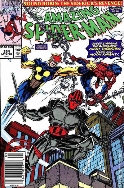 ROUND ROBIN: THE SIDEKICK'S REVENGE! PART 2 - WILDE AT HEART! Following their battle with Midnight, Spider-Man and Darkhawk watch as a Secret Empire flying platform head towards a group of innocent bystanders. Quick thinking, Darkhawk tells Spider-Man to throw him in the direction of the craft and uses the extra momentum combined with his gliders to catch the craft and redirects it to a nearby building. When it crashes, it drops debris on the crowd below. However, before they can get harmed, Spider-Man swoops in and catches the debris in webbing. Darkhawk blames himself for not thinking his plan through. Spider-Man tells him not to be so hard on himself as his instincts were in the right place, even though his execution was sloppy. Going up to the rooftops, Spider-Man asks Darkhawk why his force field faltered when they had Midnight pinned. Darkhawk explains that Midnight's accusations of being abandoned by Moon Knight struck a chord with him. Spider-Man understands, but tells Darkhawk an abridged version of his origins, telling the young hero that and how his inaction to catch a crook led to the same crook murdering his Uncle Ben. Seeing that the wall-crawler is visibly upset, Darkhawk promises to take his speech about power and responsibility to heart. The two heroes part ways and Spider-Man feels that Darkhawk is going to be okay as a hero. When Peter recovers his camera and returns to his Aunt May's house, he discovers that both his aunt and wife Mary Jane lost track of time while he was out as Spider-Man. As Peter and Mary Jane leave, Mary Jane notices that Peter is in a somber mood, but knows her husband well enough not to press him to talk during one of these moods. The couple then goes to the Daily Bugle, where Peter drops off the photos of Spider-Man and Darkhawk's battle with the Secret Empire to Joe Robertson. When Peter finally tells the story to Mary Jane, she finally understands why Peter is in such a down mood. Peter points out that this particular battle hits close to home because both Darkhawk and Midnight are two sides of the same coin. That evening on the Upper West Side, Midnight and Elliot Franklin arrive at a nondescript dry cleaner that functions as the passageway to the Secret Empire's secret facility. They are greeted by Number Seven who is upset with the amount of attention that he drew to himself. Midnight is angry by this criticism, pointing out that he was able to hold his own against both Spider-Man and Darkhawk. He also points out that if Eliot Franklin is as good at weapon design as they say he is, Midnight will become even more powerful than ever before. Number Seven orders Midnight back to his room. Although the cyborg complies, he vows to make Number Seven pay for it later. Number Seven gives Franklin a tour of the facility and the various weapons they are developing for Midnight. Eliot points out that Midnight doesn't appear to be a team player and that any cyborg armies the Empire is looking to create may not be happy with the enhancements they intend to make. When Number Seven asks about recruiting former super-villains for augmentation, such as his former teammates in the Wrecking Crew. Eliot reminds them that he and his former allies no longer have their powers, and that super-villains are hard to control. He suggests that their best bet is to try and recruit young and impressionable super-heroes to join their cause. At first, he thought that the New Mutants would be useful candidates, but mutant is suspicious of humans. However, he points out another group of super-humans that might be ripe for manipulation, the New Warriors, and particularly the unfocused Nova. At this moment, Midnight is losing his temper in his quarters. That's when his nurse, Lynn Church, who insists that she has a legitimate concern for his well being. He expresses his anger over being left for dead by Moon Knight, the man who was also responsible for the death of his father. He has now vowed that he will destroy Moon Knight. Tossing a broken chair leg at the mirror, it shatters revealing a listening device hidden there. Having developed feelings for Lynn, he promises her that after he has destroyed Moon Knight, he will give her the whole world. Later, at the Punishers warehouse headquarters, his assistant Microchip reads the recent edition of the Daily Bugle. He radios the Punisher about Eliot Franklin's jailbreak by Midnight and his connection to the Secret Empire. The Punisher finds this interesting and tells Micro that he will look into it after he has eliminated a gang of drug dealers he had been stalking. With that, the Punisher leaps through a skylight into the warehouse below, gunning down the drug dealers where they stand. While at Avengers Headquarters, Spider-Man meets with Captain America in the hopes they can reach Moon Knight through their mutual connections with the Avengers. They are able to get in touch with Moon Knight through the Avengers ID card that he still carries. After hearing Spider-Man's news that Midnight is still alive, he tells the wall-crawler to keep in touch with him as he conducts his own search. Meanwhile, Nova is flying across the city when he is suddenly ambushed by Midnight. However, instead of looking for a fight, he begins trying to convince Nova to join the Secret Empire. By this time, Peter Parker has returned to his apartment and when Nova and Midnight fly by overhead the spider-tracer he planted on Midnight triggers his spider-sense. Peter quickly changes into Spider-Man and follows after the signal, much to the chagrin of Mary Jane. En route, Spider-Man contacts Moon Knight to tell him about spotting Midnight. Meanwhile, Nova counteracts Midnight's offer by pointing out the times that the Secret Empire attacked a police station and their recent attempt to launch a missile from an office building. Midnight explains that the Secret Empire works outside of the law for the good of mankind. Nova doesn't totally buy this but decides to p