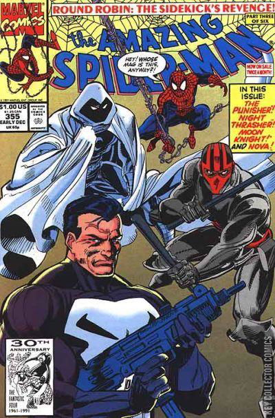 ROUND ROBIN: THE SIDEKICK'S REVENGE PART 3 - TOTAL ECLIPSE OF THE MOON... KNIGHT Spider-Man, Moon Knight, and Night Thrasher are chasing Midnight after he captured Nova in order to try to recruit him into the Secret Empire. This chase is helped thanks to a spider-tracer that Spider-Man tagged on Midnight. En route, Midnight calls back to his employers in the Secret Empire and asks for assistance in getting the pursuing heroes off his trail. As he slips into a secret passage hidden in a water tower, unaware that he is being watched by the Punisher who has been investigating the Secret Empire's connection to the drug trade. The Punisher debates going in with guns blazing when he spots Moon Knight's Moon-Copter flying by. On board, Spider-Man's spider-sense tells the others that they are near where Midnight is hiding. Night Thrasher's helmet scanners pick up the Punisher's position and the three heroes leap down to confront him. Although they quickly determine that the Punisher wouldn't be in league with the Secret Empire, he is still unhappy to see them. That's because their sudden confrontation has given away Frank Castle's position. Suddenly, they are surrounded by the members of the Secret Empire. As the heroes go into action, the Punisher asks Night Thrasher is working with soft-hearted heroes. Hearing Spider-Man's quipping through the battle, Night Thrasher jokingly questions his judgment as well. While the Punisher is willing to use lethal force, Spider-Man is against this idea, wanting these foot soldiers to be alive to be questioned by the police. That's when Midnight leaps out of the secret entranceway and ambushed Moon Knight. Enraged, Midnight blames Moon Knight for leaving him for dead after being his faithful sidekick. Before he can eliminate his former mentor, Midnight is attacked from behind by Night Thrasher. When Night Thrasher stops and demands to know where Nova is, he is ambushed by Grasp of the Seekers, a group of mercenaries who have a strong dislike for superheroes.[Continuity 3] Sonic and Chain also join the battle, with Sonic incapacitating the Punisher with an energy leeching device that clamps onto the vigilante's chest. As Spider-Man helps his allies fight against Grasp, Sonic, and Chain, Midnight resumes his attack on Moon Knight. Having successfully stalled the heroes, the Seekers make their escape. Seeing this from the Moon-Copter, Moon Knight's assistant Frenchie asks if he should pursue, but Moon Knight tells him to stay and assist. Just then, Midnight escapes in a flying ship that was hidden in the water tower. As it takes off, it blasts the Moon-Coper forcing Frenchie to make an emergency landing on the roof. In the aftermath of the battle, the other heroes notice that the energy leech is still attached to the Punisher and is killing him. Quick thinking, Night Thrasher cuts the device off the vigilantly using a wrist mounted blade hidden in his armor. Punisher thanks them for the quick assist, and passes out from the experience. Frenchie reports back to Moon Knight, telling him that he can have the Moon-Copter up and running again in ten minutes. Meanwhile, at the Secret Empire's headquarters, Midnight delivers Nova to his masters much to the Secret Empire's delight. Midnight suspects that there must be a tracking device on him somewhere and asks the Empire to have their technicians give him a once over. After a quick body scan, they locate Spider-Man's spider-tracer. Before the Secret Empire can examine it, Midnight impulsively crushes it. At that moment aboard the Moon-Copter, Spider-Man senses the signal suddenly cut out. Figuring out their next course of action, Spider-Man suggests that they go to the Avengers. However, the Punisher deliriously begins talking about how his family was murdered by mobsters. This admission gets each of the others heroes thinking about their own personal tragedies. Night Thrasher speaks for all of them when he suggests that they need to find Nova on their own. Meanwhile, back at the Secret Empire's headquarters, Eliot Franklin goes over Midnight's cybernetics to prepare them for upgrades. When Number Seven asks when they can do the same for Nova, Franklin points out that since the hero's powers are natural, they need to do more research as cybernetic enhancements might actually make him weaker. This angers Midnight, as he sees himself as the leader of the Empire's army of cyborgs and he lashes out. Number Seven reminds him that they will do whatever they think is best for the organization and threatens the cyborg with a pain-inducer. This quickly changes Midnight's tone and he stands down. As Number Seven turns his attentions to other matters, Midnight realizes that there is nothing he can do to improve his situation so long as his superiors have the pain-inducer to keep them in line. Number Seven begins discussing with his associates who will succeed their recently deceased leader Number One. When Number Seven nominates himself, his associates begin to argue against his nomination. Seeing a division in the ranks, Midnight begins planning on a means of exploiting this for his own benefit. Uninterested in the future leadership of the Secret Empire, Eliot Franklin takes Midnight into the lab for his upgrades. The cyborg is strapped to a table, he begins to scream in agony as the upgrades are being done. Among those assisting Franklin is Lynn Church the nurse who has been caring for Midnight during his transformation. She can't bring herself to watch him in pain and excuses herself from the operating theater. Outside, she bumps into a technician and orders him to install a device into one of Midnight's vertebrae. When the technician balks at this order, something in her eyes frightens him into complying. As he rushes off to carry this task, she advises him against telling anyone her orders. As the technician rushes into the operating room, Lynn's are visibly glowing amid the shadows of the hallway.