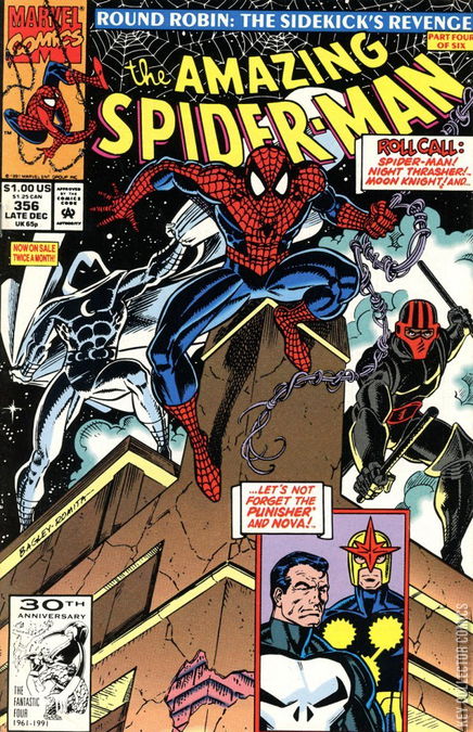ROUND ROBIN: THE SIDEKICK'S REVENGE PART 4 - AFTER MIDNIGHT! Aboard Moon Knight's Moon-Copter, the hero plans with Spider-Man, and Night Thrasher about their next course of action to rescue Nova from the Secret Empire. They were able to track their cyborg operative Midnight until he destroyed the spider-tracer that allowed them to track him. Recovering from an attack by an energy leech, the Punisher warns them that they need to stop the Secret Empire immediately as they are planning to build an army of cyborgs. Night Thrasher blames Moon Knight for this situation because Midnight was his former partner. This almost leads to both men coming to blows, but Spider-Man gets between them. Suddenly, Night Thrasher remembers that all members of the New Warriors have emergency communicators on them, including Nova. With this new lead, the heroes begin working on a means of tracking down Nova's radio signal. Meanwhile, at the Secret Empire's secret laboratory, Eliot Franklin concludes the painful upgrades on Midnight's body and leaves the operating room. Nurse Lynn Church then instructs the other technicians and surgeons that they have one last item to install. When they balk at her orders, they suddenly change their minds when they look her in the eye and what they see frightens them. Although they are worried at being caught, Lynn assures them that she has devised a distraction for them. Elsewhere, Eliot Franklin checks on the equally painful examination of Nova's physiology to determine if cybernetic enhancement would enhance the young hero or not. However, the members of the Secret Empire are unable to determine the origins of Nova's powers. That's when Franklin notices that someone had disengaged the signal jammer in the lab, leaving them open for detection. Although the jammer is reactivated, it is too late, as, at that moment, Frenchie manages to lock in on Nova's location. Realizing it was too late, Eliot Franklin storms out of the lab to warn his employers about this recent development. He interrupts the high ranking members of the Secret Empire as Number Seven continues to state his case to take the place of their deceased leader Number One. Franklin warns them the heroes are coming and recommends that they leave this facility. However, Number Seven refuses to give up this location and orders that their position be fortified. At that moment, the Moon-Copter attempts to land on the building that acts as a front for the Secret Empire, hidden weapons begins to open fire. As Frenchie lands the copter somewhere nearby, the Punisher insists on going along, even though he is still weak after his ordeals. However, Night Thrasher convinces him to stay and continue recovering and act as back up. The other crashes through the false business front and are confronted by an army of Secret Empire soldiers. However, the combined forces of Spider-Man, Moon Knight, and Night Thrasher make short work of these foot soldiers. As the heroes continue to fight there way into the facility, the heads of the Empire are joined by Lynn Chruch who is uneasy on her feet. Dismissing her condition, Number Seven orders her to send Midnight in to stop the heroes, even though he just recently has gotten out of surgery. Lynn then goes to Midnight and tells them that his masters want him to fight the heroes again. However, she reveals that she sabotaged their pain-inducers and he now has the freedom to choose his next actions. Midnight thanks her and assures her that he will repay her soon. As the heroes draw closer to the heart of the facility, Number Seven demands to know where Midnight is. That's when the cyborg enters the room and makes his bid to take over the Secret Empire. When Number Seven tries to activate the pain-inducer, he is shocked to discover that it no longer works. Midnight then murders Number Seven and tells the others that he will get them out of this situation. By this point, Spider-Man and the others have defeated all the soldiers. Spider-Man's spider-sense goes off, barely warning him and the others of Midnight's ambush. The cyborg focuses on Moon Knight, intending to kill him for leaving him for dead. The other heroes pile on. Night Thrasher tries to relate to Midnight, telling the cyborg about the death of his parents. However, these words do not get through to Midnight. Ultimately, Spider-Man ends up wrecking one of Midnight's arms, forcing him to flee. Night Thrasher tries to go after him in an effort to save Nova, but the wall-crawler pulls him back. Night Thrasher is furious, but Spider-Man explains that going after Nova alone wouldn't help either of them. Moon Knight suggests they get back to the Moon-Copter to follow after them. Meanwhile, the ranking members of the Secret Empire flee in a ship. Inside, Midnight informs them that he is taking over, warning them that if they protest he will kill them all as easily as he did Number Seven. Midnight then tells Lynn Church that once he is repaired he will build an army of cyborgs to take over the world in her name. Back on the rooftops, the heroes return to Frenchie at the Moon-Copter. It's there that Spider-Man discovers that the Punisher slipped away during the battle, and they quickly realize that he must have stowed aboard the Secret Empire's ship.