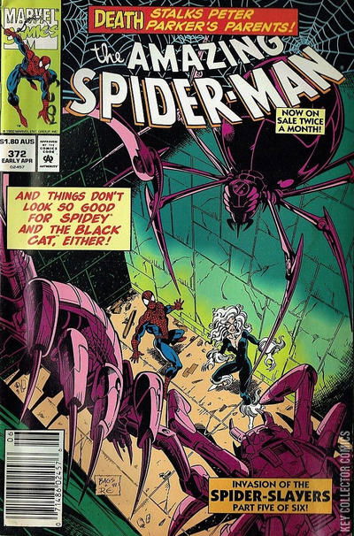 INVASION OF THE SPIDER-SLAYER PART 5 - ARACHNOPHOBIA TOO Following the failure of the various Spider-Slayer robots, Alistair Smythe refuses to let himself go into his impotent rages of past failures, as he has upgraded his body and become the Ultimate Spider-Slayer. The recent failure of the Spider-Slayer created by Max Young has deeply disappointed Smythe who responds by electrocuting Young as punishment. He tells his other captives to remember that here, he is god. Meanwhile, Peter Parker and Felicia Hardy have returned to Queens after their recent battle at an upstate institution. Arriving at Aunt May's house, he spots the people claiming to be his parents being shown into the car of FBI agent Charles Shaddock. Unsure of what is going on, Peter manages to tag Shaddock's car with a spider-tracer in case he has to find them later. Peter is welcomed by his Aunt May when he enters her home, but she is less than enthusiastic to see Felicia Hardy. Peter calls the FBI to try and learn what he can about Agent Shaddock but gets the runaround. After suggesting to May that he and Mary Jane come over for dinner. On the way out, Peter tells Felicia that this situation is getting personal, and gives her a chance to bow out if she wants. However, Felicia insists on tagging along. Changing into costume, Spider-Man and the Black Cat begin searching the city. Using his spider-sense he tracks the signal from his spider-tracer. To ensure that they are not interrupted by another Spider-Slayer attack, they are remaining vigilant for Smythe's miniature surveillance spiders. Unfortunately, as they pass over a construction site, they are attacked by a massive mechanical black widow spider. The Black Cat is able to cut it's web, sending it crashing to the ground below. On the steel girders, the pair remark how easy it was to defeat this Spider-Slayer when they are almost ambushed by two more robots, one fashioned after a tarantula and the other as after a scorpion. The pair split up to deal in order to deal with each threat. Spider-Man is followed by the tarantula robot and tricks it into leaping off the building. Although he thinks both it and the black widow were destroyed, the two find each other and the Black Widow climbs up on top of the tarantula. Meanwhile, the Black Cat is not having much luck damaging the scorpion robot with her talon-knives. She gets caught in the robot's clutches and it begins to squeeze until she screams in agony. Spider-Man comes to her rescue, striking the scorpion with a steel girder, freeing the Black Cat and knocking the scorpion to the ground. As the Black Cat recovers from the attack, the pair are ambushed by the three robots, that have combined into a single gestalt form. While they fight, Spider-Man deduces that high voltage electricity might short out the robots. To this end, the Black Cat slices open the robot with her claws. This allows the wall-crawler to toss a live wire into the open circuitry. There is a powerful jolt of electricity and although Spider-Man leaps to safety, the Black Cat is jolted by it. The robot is destroyed, but the Black Cat still needs time to recover from the jolt she got and tells Spider-Man to continue going after his parents ahead of her. Following the spider-tracer signal, Spider-Man tracks Richard and Mary to an industrial park in Canarsie. By this point, he has changed back into Peter Parker in order to keep a low profile. He slips into the meat processing plant where Shaddock has taken his parents. From the rafters, Peter can see the people who allege to be his parents. They are being held at gunpoint by Shaddock, who reveals that he was one of the spies who worked by the Red Skull. As Peter walks along the ceiling beams, his spider-sense warns him that the wood has gotten rotten. Unfortunately, when he leaps from one beam to the other, it breaks under his weight. Peter goes falling through some pipes, getting blasted with the freezing compound used to keep the meat at the plant fresh. His luck continues to work against him as he lands on a conveyor belt that leads to an incinerator. With his secrecy blown, Shaddock activates the conveyor, sending the stunned Peter Parker closer to the flames. PUNCH...COUNTER-PUNCH Peter Parker has agreed to a sparring match with Flash Thompson. As the two men climb into the ring, Flash can't help but remember the time that Peter "sucker-punched" him in a boxing match back when they were in high school. Flash promises to go easy against Peter now that he has had a few professional fights under his belt. As they begin to fight, Peter is quick to dodge Flash's punches thanks to his spider-sense. The pair begins to talk about the apparent return of Peter's parents. Peter explains that the entire experience has him freaked out. Flash tells him to see sense, wondering who would intentionally trick him, pointing out that Richard and Mary's story is plausible. Peter supposes Flash is right, but can't tell his friend about his fears that this is some kind of trick being played on him by one of Spider-Man's many foes. Realizing that he is letting his spider-powers make it too easy, Peter allows Thompson to land a few blows. Changing the subject, Flash asks Peter if he remembers the time he said that he never bullied Peter when they were in high school. He admits that he wasn't telling Peter the full truth, and begins telling Peter about his father. He explains that his father was an academic who had little interest in sports and thought they were a waste of time. Seeing the type of student Peter was, and how his father would have liked him, made Flash jealous and he targeted Parker because of it. He apologizes to Peter for all the torment he caused in high school. Peter accepts his apology and asks if Flash ever reconciled with his father. Flash explains that he never did, that his father died of a heart attack years before they first met. Using this as a comparison, Flash tells Peter to give his parents a chance