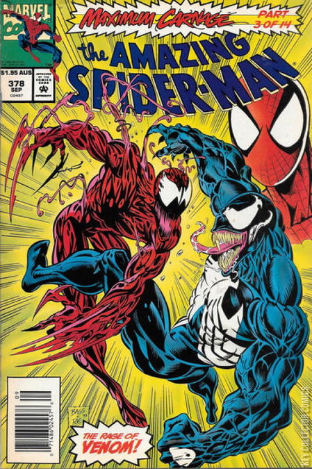 MAXIMUM CARNAGE PART 3 -DEMONS ON BROADWAY Maximum Carnage continues from Web of Spider-Man #101... Eddie Brock arrives at Laguardia Airport. There, he sees a newspaper concerning a headline involving Carnage. He speaks aloud concerning his intention to kill Carnage, and transforms into Venom. When Airport security clumsily attempts to apprehend him, but he flees. While he approaches the city, Venom laments how he feels responsible for Carnage, as his symbiote created him and vows to destroy him. Meanwhile, Cloak and Spider-Man are nursing their wounds in the Holy Ghost Church. Cloak is beside himself with grief from losing Dagger to a surprise assault by Shriek. He expresses grief and then rage, swearing to make Shriek pay. Spider-Man then leaves to pursue leads concerning Carnage. He thinks about how he can relate to Cloak, given the many people in his life he has lost because of his career as Spider-Man. Spider-Man, while searching, considers the fact that Carnage has teamed up with the Doppelganger and Shriek and how death and life work in a balance. Halfway across the city, Carnage confronts Shriek and Doppelganger about their going after Spider-Man without him. Carnage effectively puts Shriek in her place, indicating that Spider-Man is his. "Every bone and sinew, every drop of blood or bile... MINE!" At that moment, Peter Parker's wife Mary Jane waits for her husband to return home. She is smoking again because she is worried about her husband. On the other hand, he thinks about those who he has recently discovered are still alive, like his parents. When she sees the beating that her husband has taken, she is angry that he went back on his word to stop being Spider-Man for a while. He tries to weasel around on this, Peter tells her that he said he would try. This makes Mary Jane even angrier, as she thinks he didn't try very hard. At this time, believing Shriek to be in danger from Carnage, the Spider-Doppelganger attacks the symbiotic serial killer. Using a piece of the alien symbiote, Carnage easily knocks Doppelganger away. Carnage then informs Shriek that this "band" has one leader - him. Back at the Parker's Soho apartment, Mary Jane figures that Peter's enhanced healing will have his broken rib after a night's rest. Unfortunately, Peter explains that he can't rest while Carnage and his allies are still on the loose and intend to go back out hunting for them immediately. Simultaneously, in psychopathic fashion, Carnage and Shriek makeup, agreeing that if they are going to kill, they are going to kill together. Things are not quite so copesetic at the Parker household. Mary Jane refuses to let Peter go out and get himself killed, especially after they just recently lost Harry Osborn. However, Peter can't shirk his responsibility, especially since they killed Dagger. Unable to speak sense to her husband, Mary Jane breaks out into tears and turns away from her husband. Meanwhile, in Central Park, a police patrol car is ambushed by Carnage and his twisted family. While Carnage rips the roof off a couple's car, and then viciously murders both. Shriek then eradicates the vehicle. This draws out a beat officer who comes to see what all the commotion is. Ambushed by the Spider-Doppelganger breaks the neck of the officer. Committing murder as a team comes as a delight to Carnage who suggests that they continue to spread their chaos and bloodshed to others. While near the Bowery, Spider-Man is searching for Carnage and his cohorts, although he can't keep his mind off the troubles his marriage is facing at this time. His thoughts are interrupted when he spots the Demogoblin. Remembering Demogoblin's ties to the Spider-Doppelganger, he hopes that the demonic creature can lead him to Carnage and his gang. Spitting the wall-crawler, the Demogoblin doubles back and ambushes Spider-Man. The wall-crawler is struck by one of Demogoblin's black pumpkin bombs. The bomb discharges a liquid shadow, which clings to Spider-Man and causes him to feel immense cold and feel senses of hopelessness and loss. Demogoblin flaunts his success while Venom swings through the city looking for Carnage. Hearing a radio report from a nearby taxi cab, Venom is made aware of the altercation between Spider-Man and Demogoblin, but when he hears about a disturbance in Central Park. Correctly suspecting that Carnage is responsible, Venom decides to go there. As Demogoblin prepares to kill Spider-Man, a preacher approached the villain from behind. As Demogoblin turns his murderous intentions on the preacher, Spider-Man forces himself out of his despair and delivers a devastating blow to the villain. As the wall-crawler checks on the preacher, Demogoblin throws another pumpkin bomb. The web-head successfully dodges the explosion, but his actions inflame his broken rib. Before things can escalate any further, Demogoblin flees. Spider-Man feeling immense pain decides to cut his losses and go home. Venom arrives at Central Park and engages Carnage, Shriek, and Doppelganger. That evening, while Peter recovers, he and Mary Jane are watching the news coverage of Carnage's mayhem and there's a knock at the door. Mary Jane answers it to find a severely injured Venom, barely conscious.