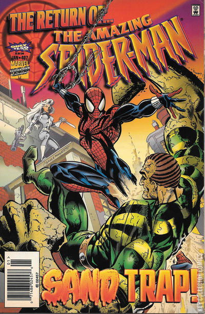BLAST FROM THE PAST! The Clone Saga continues from Sensational Spider-Man #0.... J. Jonah Jameson is disappointed with the front page of the Daily Bugle. This edition asks the question "What Happened to Spider-Man?" because the photo that has been used doesn't grab the same sort of attention as the headline. In fact, Jonah thinks the photo is one of Peter Parker's old photos that the Bugle has in the archives. When Jonah asks if Joe has heard from Parker since he left town with his wife to prepare for their coming baby. Unfortunately, Joe hasn't heard a word from the Parkers since they left. Getting back on topic, Joe asks Jonah if he thinks that they are dealing with a new Spider-Man in the city. This is because after not being seen for a few weeks, the wall-crawler reappears with a new costume. Adding to the mystery are unconfirmed sightings of the wall-crawler in Portland. Jonah begins getting so upset that he pulls out a cigar from his desk drawer. He is about to light up when Joe Robertson reminds Jonah that he gave up smoking cigars. Looking out the window, Joe Robertson witnesses the Human Torch streaking by and realizes that their story has struck a chord with someone else. The Human Torch also wants to know the truth and as they have been allies for years, he wants to get to the bottom of the issue, particularly since the wall-crawler recently came to his aid. To this end, the Torch uses his flame powers to write a message to Spider-Man in the sky, asking the web-slinger to meet with him at the usual place, figuring that if this is truly the original Spider-Man, he will know where to meet him. At that moment, at the Daily Grind, Ben Reilly strikes up a conversation with Buzz, a regular patron about the entertainment section of the Daily Bugle. That's when his boss, Shirley Washington, jokingly tells Ben not to let Buzz distract him from the job. As Ben begins preparing the next drink order, he thinks about how he has been trying to make a life for himself as Ben Reilly. Even though he discovered that he has been the real Peter Parker and the man who has laid claim to that identity is now a clone. That's when another regular, the fashion-obsessed Desiree Winthrop enters the Daily Grind with her friends. The topic of their discussion is the Human Torch's message to Spider-Man that has appeared in the sky. When Ben goes to take her order, Desiree recognizes him even though Reilly has recently bleached his hair. As he takes their order, Ben can't help but think about what sort of relationship Peter Parker had with the Human Torch in the five years he operated as Spider-Man, and fondly recalls how they often worked together. Meanwhile, at the Symkarian Embassy, Silver Sable informs the Sandman that the recent crop of new recruits for the Wild Pack have just arrived. As they head for the gym, Sable sends Sandman to confront them, only telling him to go easy on them. Against the Sandman this group of soldiers lasts only fifteen seconds, however, the Sandman assures her that they will be able to last 20 seconds after a few weeks of training. That's when Sable shows Sandman the front page of the Daily Bugle. Although she figures this is just more of J. Jonah Jameson's bluster, she wants to investigate since it would be prudent to learn if Spider-Man has been replaced as he often worked as a freelancer for Silver Sable in the past. A few hours later, the Human Torch has decided that he has waited long enough and heads for the Statue of Liberty, in the hopes that Spider-Man arrives for his meeting. As he streaks across the Manhattan skyline, the Torch is unaware that he is being monitored by members of the Wild Pack. Elsewhere, someone is watching the meeting between Spider-Man and the Human Torch. Shockingly, the Torch tells Spider-Man that he has come to eliminate the wall-crawler and incinerates the masked hero in a flame blast. However, this is nothing more than a simulation created by Mysterio, the master illusionist. He was running a test of the new digital imagery transmission chip that he had recently stolen. He is impressed with its ability to create a simulation of any situation down to the minute detail and begins plotting his ultimate goal: the destruction of Spider-Man. Meanwhile, Ben Reilly pays a visit to his friend Seward Trainer. His body is still in a coma since his mind became trapped in cyberspace. He prays his friend will wake up, and promises he will be back to see him tomorrow. As he leaves the hospital, Ben laments over the current state of his life and tries to come up with some ideas on what to do next, ultimately deciding to go meet with the Human Torch. Soon, Ben goes down to the ferry terminal to catch a boat to the Statue of Liberty. Also, there are Silver Sable and the Sandman, who has correctly deduced that Spider-Man would need to take a ferry to Liberty Island and are keeping an eye out for him. Spotting the Sandman in the crowd, and unaware that the former criminal has reformed, slips away to change into Spider-Man. Once in costume, Spider-Man confronts the Sandman and Silver Sable. When he refers to Sable as a "blonde cutie", Sable orders Sandman to go all out to test and learn this is the real Spider-Man or another man. Sandman chastizes Spider-Man for disrespecting Silver Sable, pointing out that even Doctor Doom treats her with respect. Spider-Man recognizes Sable's name as he once saw her on a late night talk show. As the battle rages on, Jessica Caradine develops photos she recently took of the new Spider-Man in the dark room of Centennial University. Aminique, Jessica's classmate, is impressed with the quality of the photos. She suggests that they rival that of Peter Parker's photography of the wall-crawler and suggests that she could sell them to the Daily Bugle for a decent amount of money. Back at the ferry terminal, Spider-Man continues to evade the Sandman's attacks, suggesting that they stop fighting and talk. The Sandman is willing to do so 