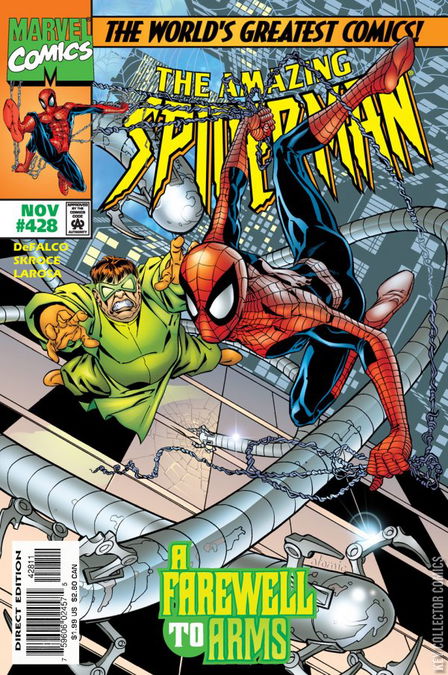 LIVING LARGE! Spider-Man finds it impossible to believe that Doctor Octopus is back from the dead. However, the reality sinks in real quick when the debris created by the Doctor's flailing arms falls toward a little girl trying to escape. Spider-Man swoops in and rescues the girl, who is unhappy that the wall-crawler couldn't also save her bike. As Spider-Man carries the girl to safety he is still being followed by his oldest and greatest foe. Not far away, at a meatpacking plant, the Rose and Carolyn Trainer -- the successor of Doctor Octopus -- assess what happened during the ceremony that brought Otto Octavius back from the dead. Since Master Zei and his minions are now dead, the Rose quickly deduces that trying to use the life force of Stunner, who was only present as a virtual proxy, backfired on them. After seeing Stunner's virtual form discorporate, Carolyn Trainer worries about her fate as well as worry about her beloved Otto who is still suffering the shock of being resurrected and seeing his greatest foe. Back on the street, Spider-Man continues to evade the attacks launched by Doctor Octopus until he can get the little girl in his arms to safety. Otto continues lashing out, his mind consumed with nothing but thoughts of wanting to destroy the wall-crawler. That's when he tries to crush the web-spinning hero between two cars. However, Spider-Man manages to leap into one of the vehicles where he finds something that could help him in this life and death battle. At that moment, at Empire State University, Jill Stacy shows her friends Mary Jane and Shantal Wilsk an advertisement of the upcoming ESU toga party. While the other two women are interested in going, Mary Jane isn't sure she'll be able to convince her husband, Peter Parker, to go along. When Shantal questions what kind of man wouldn't want to keep her wife happy, Mary Jane snorts in agreement, however, she secretly knows the crushing responsibilities that Peter has in his alter-ego. Back at the scene of the battle, Spider-Man has discovered that the keys are still in the ignition of the car he ducked into. Starting the engine and hitting the gas, the wall-crawler crashes into Doctor Octopus' mechanical arms, sending him crashing to the ground. Not far away, the Rose has found Delilah and carries her away before the authorities arrive while Carolyn Trainer rushes off to join Otto. While at the Daily Bugle, Joe Robertson informs J. Jonah Jameson about the battle between Spider-Man and Doctor Octopus on the Lower Eastside. However, Jonah's mind is more occupied with the fact that he recently had to sell half of the Daily Bugle to Norman Osborn. Jameson tries to brush it off as a simple business transaction, but Joe knows the idea of selling to a man who is allegedly the Green Goblin doesn't sit well with Jonah. Jameson can only say that Joe should follow his conscience and do what he thinks is right because that's what Jonah did. Back on the Lower East Side, Spider-Man continues to battle Doctor Octopus. At this point, he is confused as to why Doctor Octopus hasn't at least alluded to the fact that he knows Spider-Man's secret identity. Back on the Lower East Side, Spider-Man finally gets in close enough to try and strike Doctor Octopus, however, he is using Carolyn Trainer's mechanical arms which also have a protective force field. Getting his coils around the wall-crawler, Otto tries to crush the life out of him. That's when Carolyn arrives on the scene and tells Octavius that they need to leave because the authorities are on their way. This allows Spider-Man to pick up some rubble with his feet and throw it into Otto's stomach with enough force to stun Octavius and free himself. Recovering quickly, the Doctor tries to resume his attack, but Trainer warns him the authorities are almost there. Instead, Doctor Octopus uses his arms to wreck a nearby apartment building, causing it to collapse. This forces Spider-Man to assist those in danger while both Otto and Carolyne flee. Returning to his home in Queens, Peter soaks in the bathtub and broods. Mary Jane tries to get him to consider the fight a win since he saved live. Still, Peter can't stop blaming himself for letting Doctor Octopus get away. Mary Jane then asks Peter if he will come with her to the ESU Toga Party. He tells her he can't because he has to look for Doctor Octopus, but Mary Jane guilts him by reminding him that he is always going after some other villain, making him realize he was being a jerk and agrees to go with her. While at the Park Plaza Hotel, Madame Qwa is furious that her brother, Master Zei, was killed in the process of bringing Doctor Octopus back from the dead and demands revenge. The Black Tarantula assures her that he will get this revenge personally, in the name of her brother. He then orders Chesbro to continue his important task. While at Trainer's secret lab, she and Doctor Octopus find Angelina Brancale in a catatonic state. Apparently, the ceremony that brought Octavius back caused feedback through her virtual reality hardware and put her in this state. Brought to tears, Otto cradles Angelina's body in his arms and blames Spider-Man for this and vows to get revenge. Meanwhile, at Empire State University, Peter and Mary Jane arrive at the toga party. While Mary Jane is dragged off with her girlfriends, Peter hangs back and is kept company by Jill Stacy, who is also attending the party. While at the Rose's penthouse apartment, Delilah soaks herself in a hot tub to relax after her battle. She is upset that the Rose has left her alone, and is starting to reconsider their partnership. That's when she is yanked out of the hot tub by a powerful man lurking in the shadows. Pinning her to the wall, this man is impressed to see that she has the eyes of a fierce warrior. However, her killer instinct quickly melts away as soon as the intruder introduces himself as the Black Tarantula. While at the Daily Bugle, Jacob Conover has been called in for a 