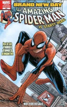 BRAND NEW DAY / SPIDER-MAN THE NEW STATUS QUO / PARK AVENUE INTERLUDE / THE ASTONISHING AUNT MAY! / HARRY AND THE HOLLISTERS This is it, Arachnophiles!!!! Prepare for what promises to be the most pulse-pounding piece of four color fiction to be delivered unto the Mighty Marvel Minions in decades! You asked for more Spidey! You demanded it! And, by Buckley, you're gonna get it! After the devastatingly heartwarming events of ONE MORE DAY, Peter Parker puts the past behind him and sets forth on a BRAND NEW DAY! Starting with Amazing Spider-Man #546, you now have THREE times the action! THREE times the villains! THREE times the danger! Amazing Spider-Man—now 3 times every month! Bank on it, buck-o! And if that weren't enough: ASM #546 goes double-sized to bring you back-up features that introduce you to the new players in the lives of Peter and his family!
