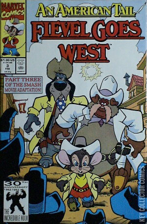 Part 3 and the final issue of Fievel Mousekewitz's struggle to find a safe place to call home. In the animated movie, An American Tail, young Fievel Mousekewitz and his family won the hearts of millions. Like real immigrants in the late 1800s and early 1900s, these loveable mice sacrificed everything to travel to America, the so-called Land of Opportunity. In this sequel, they once again pack up and head out in search of a better life, this time facing the dangers of America’s Wild West. This three-issue series is adapted from Flint Dille’s screenplay and a story by Charles Swenson, and features art by George Wildman. All the favorite characters are back, along with a few new faces. It’s a good thing, too, because Fievel will need all the help he can get to foil the plans of the villainous Cat R. Waul. Full color 32 pages on standard paper with $1.00 cover price.