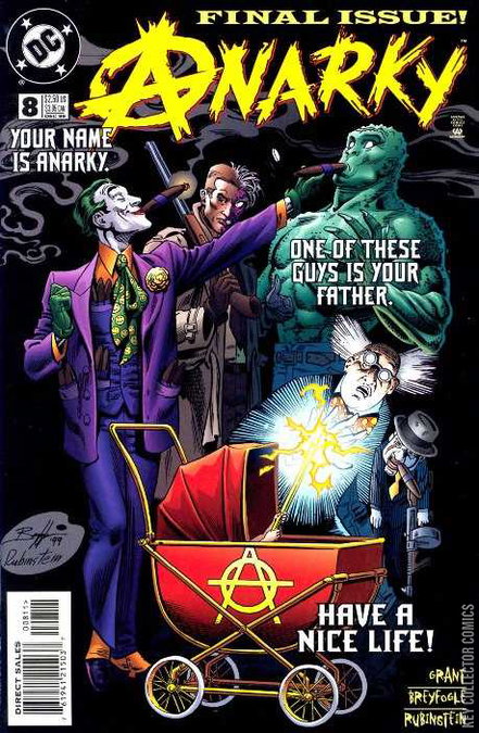 THE SINS OF THE FATHER Lonnie Machin decides to finally confront his supposed biological parents to uncover the truth of his lineage. He first meets with his alleged biological mother, Greta Mitchell, but finds that she is mentally unbalanced, due to the side effects of Joker venom she was exposed to years earlier. In a flashback, she tells the story of how she became pregnant by the Joker, and that due to her condition she was deemed unfit for parental responsibility and that her child was taken away from her. However, Lonnie is unable to get any more information from her. As a final recourse, Anarky breaks into Arkham Asylum using his teleporter and confronts his alleged father, now revealed to be the Joker. Meanwhile the Joker is in the midst of a prison break with other inmates, and takes advantage of the situation to steal the teleporter, and then forces Anarky to participate. Unarmed, Anarky plays along until he manages to regain the teleporter to escape, without the Joker having given him any clear answers either. Although the story presents no evidence, Anarky asserts that he personally believes the Joker is his father, and fears that someday he may become insane as well.
