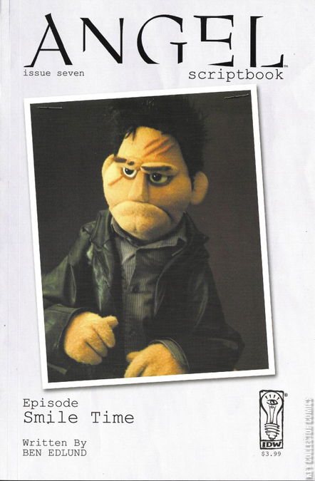 Non-comic. Script based on TV show. Written by Ben Edlund. Continuing with monthly illustrated scriptbooks based on the very best Angel episodes pulled from its five-season run. Each specially priced scriptbook will feature the entire shooting script and full-page and spot illustrations inspired by the episode from artist Jeff Johnson. This seventh script offered in this series was selected by series creator Joss Whedon as one of his favorites, and is from the fifth-season episode "Smile Time," written by Ben Edlund.