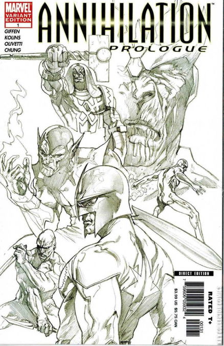 This is it! 48 pages of cosmic guts and glory! If you want to see your favorite cosmic level heroes and villains, you dare not miss ANNIHIALTION: PROLOGUE! This 48 page (NO ADS!) book is written by Keith Giffen (DRAX THE DESTROYER, THANOS), and features the stunning art of Scott Kolins & Ariel Olivetti. This is the book to read for the NEXT YEAR'S worth of cosmic stories! Get in on the ground floor as Marvel raises these great characters from the ashes! Heroes will die. Villains and heroes will form allegiances. Empires will fall. FEATURING: NOVA, SILVER SURFER, THANOS, DRAX THE DESTROYER, RONAN THE ACCUSER, AND THE SUPER-SKRULL! Retailers take note: this issue kicks off a cosmic event starting in April!