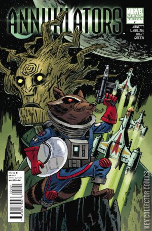 "Dark Sun Rise" They're back: The Spaceknights and the Dire Wraiths! As the Wraith's deadly Black Sun ascends and their foul magicks return, the home world of the SpaceKnights looks as if it will be the first planet to fall to their might! Only the awesome Annihilators, the newest and most powerful Marvel team of all, stand between the Wraiths and total galactic conquest! Meanwhile, Rocket Raccoon races to Planet X to rescue his old buddy Groot. But what is the secret from Rocket's past that is coming back to haunt him? All this, plus a variant cover by B.P.R.D.'s Guy Davis!