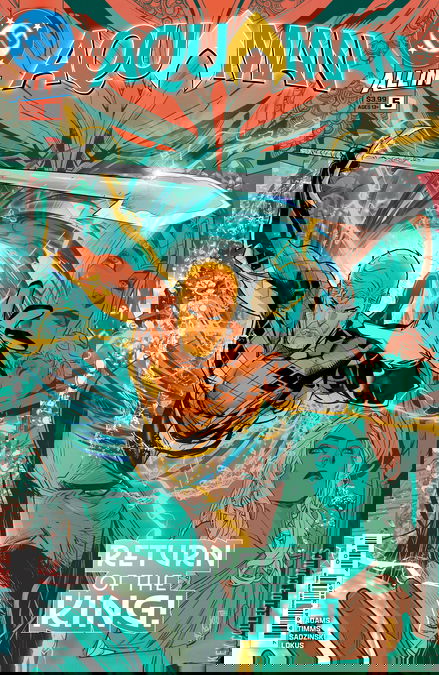ESCAPE FROM THE ULTRAMARINE! Arthur's quest to save his people has hit a devastating dead end...but hope is not lost! Together with the Wizard Arion, Aquaman must channel the incredible power of Thalassa the Trilance Saber to escape the dungeon barge descending into the blue and uncover the last desperately needed clue to save the people of Atlantis! But floating amongst all this blue appears to be...a shimmer of green?