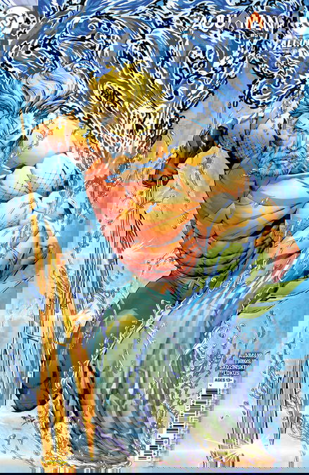 ESCAPE FROM THE ULTRAMARINE! Arthur's quest to save his people has hit a devastating dead end...but hope is not lost! Together with the Wizard Arion, Aquaman must channel the incredible power of Thalassa the Trilance Saber to escape the dungeon barge descending into the blue and uncover the last desperately needed clue to save the people of Atlantis! But floating amongst all this blue appears to be...a shimmer of green?