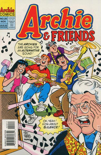 Featured Story: "Goodbye, Old Paint" (Golliher, Goldber, Esposito). After an epic food fight in the cafeteria leaves the walls a mess, Mr. Weatherbee orders the offenders to repaint. Starring Mr. Weatherbee, Ms. Grundy, Archie, Reggie, Jugghead, Betty, Dilton, Ethel, Chuck, Moose, Midge, Mr & Mrs Cooper, Mr & Mrs Lodge, Mr & Mrs Andrews. Additional Stories: Sabrina in "A Haunting We Will Go!" (Gollher, Lapick). Sabrina takes her cousin Esmeralda to a historic house. Esmeralda decides to have a bit of fun by "haunting" the home. Featuring: Sabrina, Esmeralda "A Night At The Drive In Movies" (Lisndsey). Full page artwork by Rex W. Lindsey. Featuring Archie, Betty, Veronica, Ethel, Jughead , Moose, Chuck, Nancy, Midge, Reggie "A Night in the House of Tomorrow!" (Golliher, Lapick). The Archies need a place to practice, and Veronica's experimental 'house of the future' seems to be just the right spot. Starring: Veronica, Archie, Betty, Jughead, Reggie, Mr. Lodge