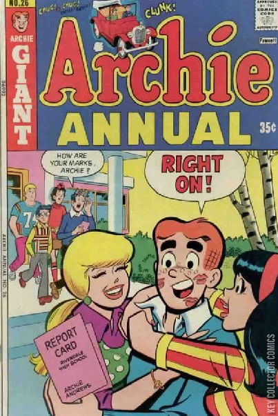Cover pencils by Dan DeCarlo. "Tired of It All," script by Frank Doyle, pencils by Harry Lucey, inks by Chic Stone; While rolling his flat tire to the garage, Archie loses control of it, with comic results. "Food for Thought," script and art by Joe Edwards; Studying only seems to make Charley hungry. "The Callers," script by Frank Doyle, pencils by Harry Lucey, inks by Chic Stone; Mary makes Fred help her clean up the house on the off-chance that The Graingers may stop by. "Birthday Boy," script by Frank Doyle, pencils by Harry Lucey, inks by Chic Stone; Reggie's surprise gift for Archie's impending birthday backfires on the Andrews lad. "Roman Holiday," script by Frank Doyle, pencils by Harry Lucey, inks by Chic Stone; Set in ancient Rome, Emperor Archibus ignores the good advice of Jugibus and seeks out Reggio instead. "Quiet on the Set," script by Frank Doyle, pencils by Harry Lucey, inks by Chic Stone; Archie and Jughead imagine themselves in a slapstick silent comedy set in the halls of Riverdale. Archie Club News. "Chivalry Is Dead," pencils by Harry Lucey, inks by Chic Stone; Jughead criticizes Archie for carrying Veronica over a puddle of water.