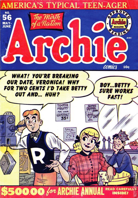 Cover by Bill Vigoda. Stories by unknown. Art by George Frese and unknown. Featuring Archie in: "Some Enchanted Evening"; "Don't Kid Me!"; "Kicking the Gang Around"; "Haste Makes Waste"; and "Mind Over Madder"! Plus: Jughead in "Dream Team"! Also: 2-page text piece "From Hollywood"! And: "Archie Fun Page"! 48 pages, full color. Cover price $0.10.