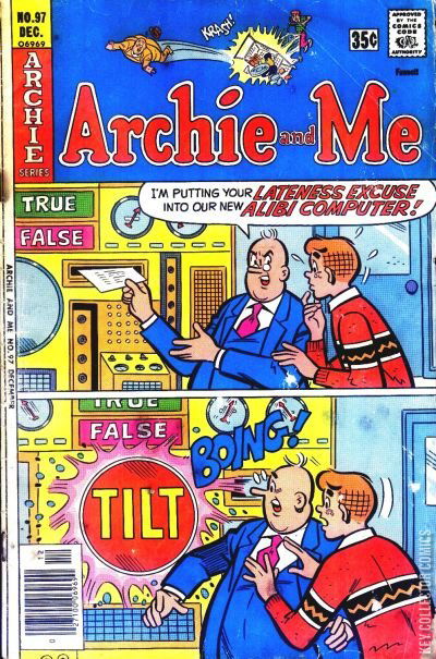 "Diet Riot," script by George Gladir, pencils by Bob Bolling, inks by Rudy Lapick; The more Mr. Weatherbee runs into Archie at the grocery store the more food he buys, ruining his diet. "Shock Yock" one-page story; Miss Grundy warns the kids that Mr. Weatherbee's nerves are on edge. "Taking Note!" half-page story starring Li'l Jinx. Archie's Gag Bag. In and Outs Maze activity page. "Old Fighter"; Archie goes fishing with Mr. Weatherbee, who is fishing for Old Fighter, a giant bass he has been trying to catch for years. "Alibi Awry" one-page story; Archie's alibi for being late doesn't work with Mr. Weatherbee. "Course Remorse"; Various expert are invited to the school to give one-day courses in various fields. Archie Club News. "Green Fever"; Mr. Weatherbee takes Archie and Moose out golfing. "Score" Hostess Fruit Pies ad starring Josie.