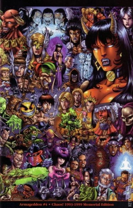 by Brian Pulido & Len Kaminski & Ross The universe-shattering finale to the Chaos Cosmos as we know it! Lady Death, Chastity, Bedlam and The Chosen join forces for one last desperate strike at Armageddon, the Father of Fear, before he can obliterate all reality. But with the power-hungry demoness Purgatori having allied herself with Armageddon, can even the combined might of Earth's "Anti-heroes" prevent the extinction of all that is? Illustrated by Luke Ross. Colored by Starlight Runner. FC (4 of 4)" Cover price $2.95.