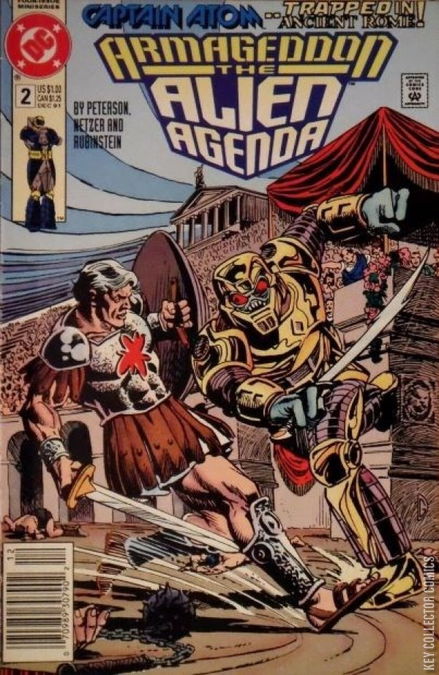 Captain Atom fights for his life in ancient Rome, while Monarch is enlisted by the aliens to help them get home in "Rome Alone". Part 2 of 4. Script by Jonathan Peterson, pencils by Mike Netzer, inks by Joe Rubinstein. Dick Giordano cover.