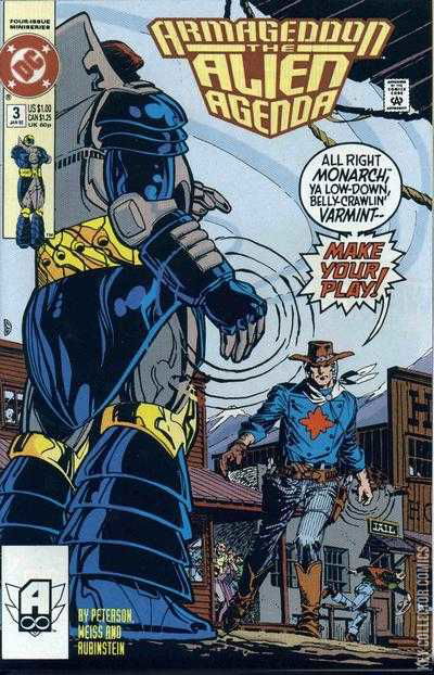 The Old West is the setting for Captain Atom and Monarch's fight to retrieve the aliens' detonator in "The West Years Of Our Lives". Part 3 of 4. Script by Jonathan Peterson, pencils by Alan Weiss, inks by Joe Rubinstein. Matt Savage, Johnny Thunder, Jonah Hex, the Trigger Twins, Pow-Wow Smith, Flame Bird, Bat Lash. Dick Giordano cover.
