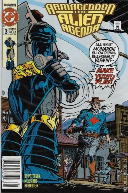The Old West is the setting for Captain Atom and Monarch's fight to retrieve the aliens' detonator in "The West Years Of Our Lives". Part 3 of 4. Script by Jonathan Peterson, pencils by Alan Weiss, inks by Joe Rubinstein. Matt Savage, Johnny Thunder, Jonah Hex, the Trigger Twins, Pow-Wow Smith, Flame Bird, Bat Lash. Dick Giordano cover.