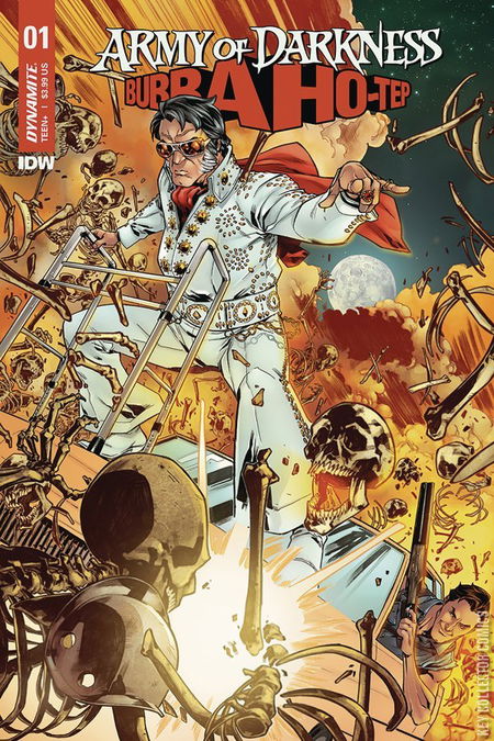 Two cult classics clash for the first time in an epic crossover miniseries: ARMY OF DARKNESS VS. BUBBA HO-TEP. Ash embarks on a soul-searching road trip to Texas on a hunch that Elvis Presley may still be alive and kicking (and supposedly vanquished a mummy)! What follows is a series of universe-spanning events that involve an Elvis jumpsuit with special time-travel abilities, a trip to 70's Vegas, plus the reveal of an evil new Book of the Dead, the Necronomicon Ho-Tep. Has Ash met his ultimate match when trading barbs with a 4,000-year-old, foul-mouthed mummy who sucks souls? Can his idol Elvis mentor him through a mid-life crisis before it becomes his final crisis? Join the adventure in a road-tripping, time-hopping groovy tale!