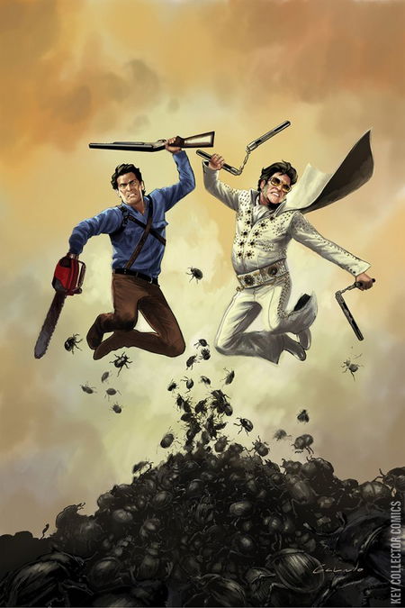 Having just scored a victory against the nefarious Bubba Ho-Tep, our heroes Ash and 70's-era Elvis take to the skies in the King's private jet, escorting the powerfully destructive Necronomicon Ho-Tep. In order to keep it out of the wrong hands, they must provide the Egyptian artifact safe passage back to Elvis' secure fortress in Graceland. But even at 20,000 feet, evil lurks closer than they realize...as do giant scarabs! It's the penultimate chapter of the year's most groovy crossover event!
