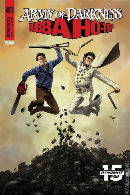 Having just scored a victory against the nefarious Bubba Ho-Tep, our heroes Ash and 70's-era Elvis take to the skies in the King's private jet, escorting the powerfully destructive Necronomicon Ho-Tep. In order to keep it out of the wrong hands, they must provide the Egyptian artifact safe passage back to Elvis' secure fortress in Graceland. But even at 20,000 feet, evil lurks closer than they realize...as do giant scarabs! It's the penultimate chapter of the year's most groovy crossover event!