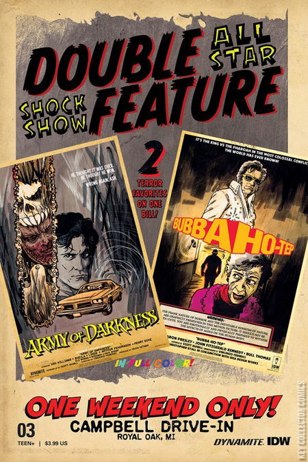 Having just scored a victory against the nefarious Bubba Ho-Tep, our heroes Ash and 70's-era Elvis take to the skies in the King's private jet, escorting the powerfully destructive Necronomicon Ho-Tep. In order to keep it out of the wrong hands, they must provide the Egyptian artifact safe passage back to Elvis' secure fortress in Graceland. But even at 20,000 feet, evil lurks closer than they realize...as do giant scarabs! It's the penultimate chapter of the year's most groovy crossover event!