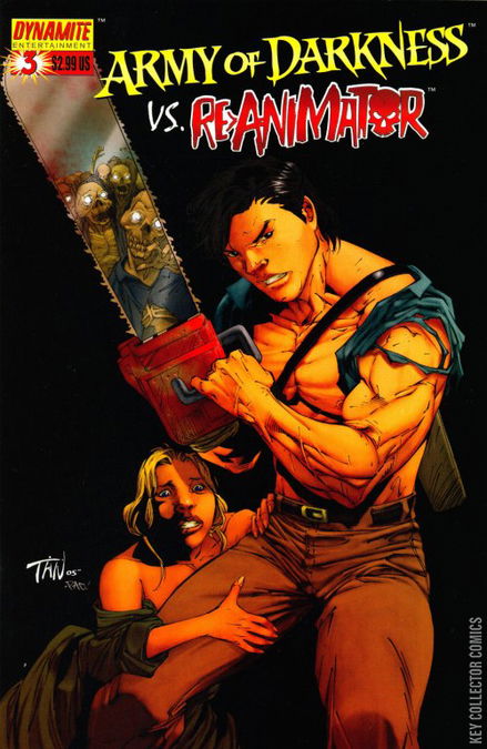Ash finds himself behind that looking glass in a world over run with Deadites. He barely escapes possessed fable-like creatures to come face to face with a harder tuffer version of Sheila. The two escape into the wood and hide out in a fruit cellar while the Deadites look for them. In the Cellar Ash is introduced to Herbie and H.P., who try to explain that there are many copies of the necronomicon, and that Deadites have taken over this mirror world and the only way to go back is threw that mirror he had entered. Ash wants to take Sheila back with him but H.P. explains she can only return when her other version looks in to a mirror too. Ash fights a Insect Version of Evil Ash and escapes threw the mirror to come face to face with anther Evil Ash and a Evil Tattoo Ash. Meanwhile Dr. West has captured Deuce and Sugarbaby and is torquring them.