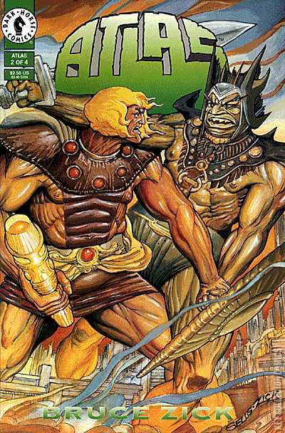 Continuing Bruce Zick's epic story of Atlas and his struggle with the Pantheon of Gods, Atlas battles the monster, Sh'en Chui, and eventually defeats it with the help of GoldenRod. As it turns out, this is just the first in a series of battles Atlas will have to face in order to secure earth from the wrath of his enemies. In this issue, we also see the creation of Atlas' idyllic Mythic Oasis, the return of his arch-nemesis, Bol, from a millennium-long hibernation, the revelation of the Seven Mythic Wonders, and our first glimpse at the ethereal home of the Gods -- Eternia. Eventually, though, the most troubling aspect of Atlas' banishment to earth becomes readily evident -- GoldenRod is losing power!