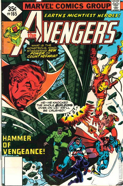 "Hammer of Vengeance!" Count Nefaria, once a non-powered villain who employed supervillains to do his dirty work, bats Captain America and the Black Panther away with incredible strength. The Beast leaps toward him and is likewise swatted away with amazing speed. The Scarlet Witch then propels a slab of concrete at him with her hex. He renders it into molten slag with laser vision. Nefaria has the combined abilities of his most recent lackeys - Power Man, Whirlwind and the Living Laser - only magnified a thousand-fold! Yellowjacket takes a crack at him but is nearly crushed in the palm of his hand. Wonder Man leaps into the fray and does slightly better… for just a moment. And then Nefaria punches him hard enough to launch him through the walls of the mansion like a rocket! Jarvis narrowly misses being pummeled by him. While Wonder Man returns to the battle, Jarvis goes to check on the Vision, who is still incapacitated from Ultron’s attack (back in issue #161) and being kept in a regenerative tank. Outside, Count Nefaria discovers he is not quite entirely unstoppable. When Captain America and the Beast hurl Cap’s shield at the villain, he snatches it out of the air, intent on crumpling it like tinfoil. He’s surprised when even his newfound strength can’t even dent it. Annoyed, he tosses it at the Black Panther and then uproots a nearby townhouse and topples it on top of them. Satisfied that he’s killed them all, Nefaria departs the scene. Meanwhile, riot police have several blocks around the mansion cordoned off. But a certain red-haired “man in black” breezes past the barricades. When an officer attempts to stop him, he flashes a badge which the cop is immediately deferential to. The red-haired man strolls into the battle scene toward the mansion. Nefaria strolls into a nearby bank and rips open the vault, sneering that his newfound powers make money useless to him -- what can take whatever he wants, so why bother with money? To demonstrate his point, he randomly grabs an attractive woman and carries her away against her will. The Whizzer challenges him and distracts Nefaria long enough to allow the woman to escape. The Count taunts the Whizzer, mocking him for his age until the Whizzer points out that Nefaria himself is well past his prime and doesn’t have too many years to enjoy his newfound superpowers. This instills Nefaria with a new purpose: he wants to become immortal! And at Nefaria’s townhouse (seen the last issue), Prof. Sturdy drags himself out of the wreckage of the lab, apparently, the only survivor after Nefaria trashed it. Iron-Man returns to the mansion after having been distracted by events in his own series. Expecting to find the corpses of the Avengers, he instead discovers that they managed to survive thanks to Wonder Man who held the debris off them. After regrouping, Iron-Man suggests the team step down and let him take on Nefaria alone. They are unanimously incensed by this suggestion and demand Iron-Man lead them or step down. The argument is halted by Nefaria’s sudden return. He wants Thor, from whom he is convinced he can extract the secret of immortality. Iron-Man leaps into action, irking his teammates whom he orders to hang back. He doesn’t succeed against Nefaria, but neither does the rest of the team when they attack. Towards the end of their second battle, the Avengers are once again losing badly. Yellowjacket flies away into the mansion, surprising his teammates who believe he’s fleeing. Count Nefaria has defeated the team but is stopped from killing them by a cascade of lightning bolts. Thor has suddenly appeared on the scene and is ready to take him on!